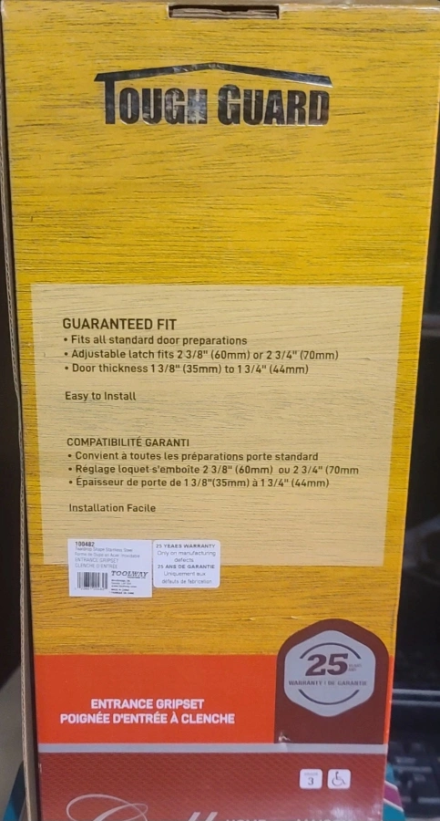 151I'm selling a brand new Tough Guard Entrance Gripset, still in its original packaging! It fits all standard door preparations and has adjustable latches for 2 3/8" (60mm) or 2 3/4" (70mm). The door thickness it accommodates is 1 3/8" (35mm) to 1 3/4" (44mm). It's also easy to install!