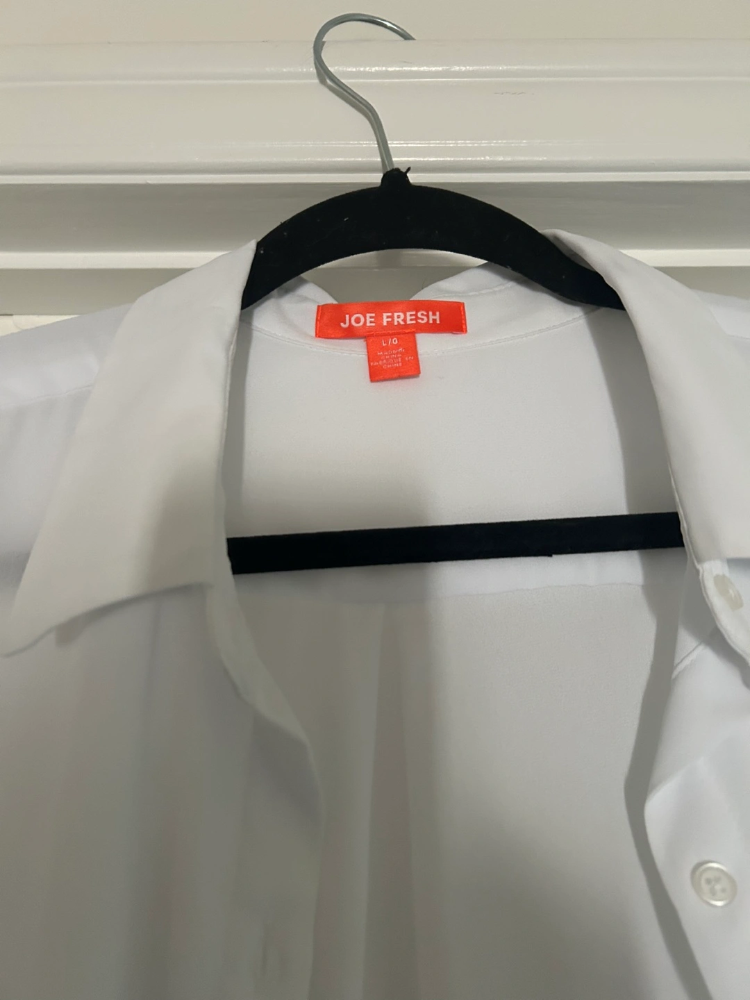 A classic white long-sleeve dress shirt from Joe Fresh! It's a size Large and in great condition. Perfect for dressing up or down, it’s a versatile addition to any wardrobe