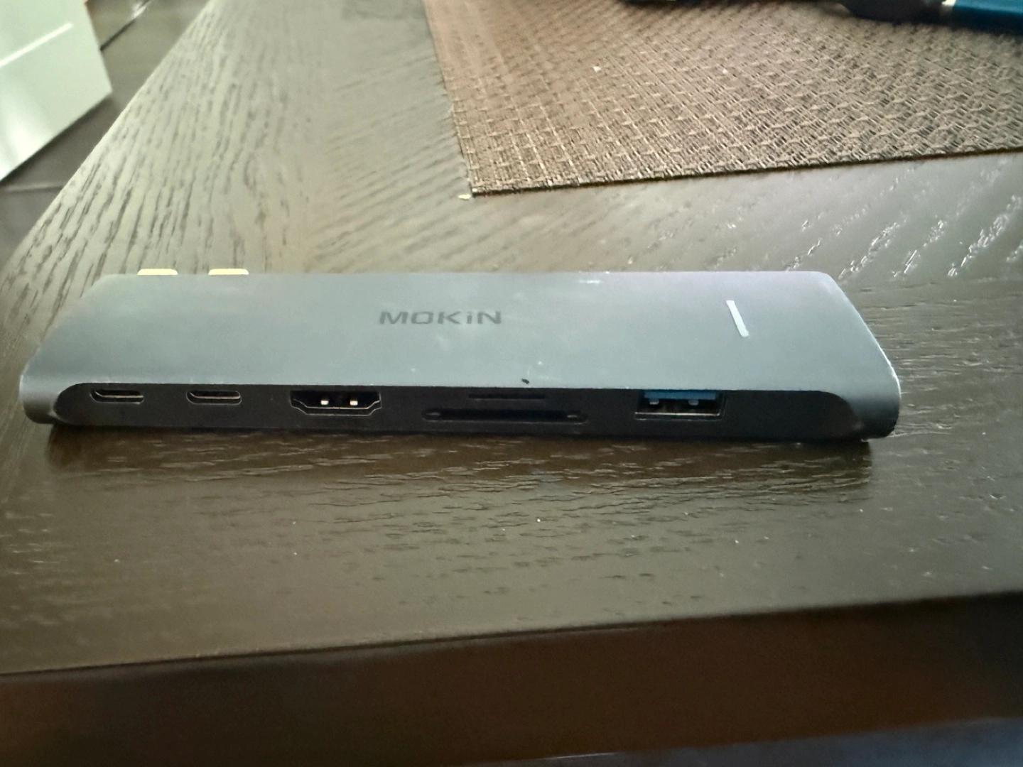 Selling a Mokin USB-C hub. It's in great condition and has a variety of ports to expand your connectivity. Perfect for laptops or tablets with limited ports!