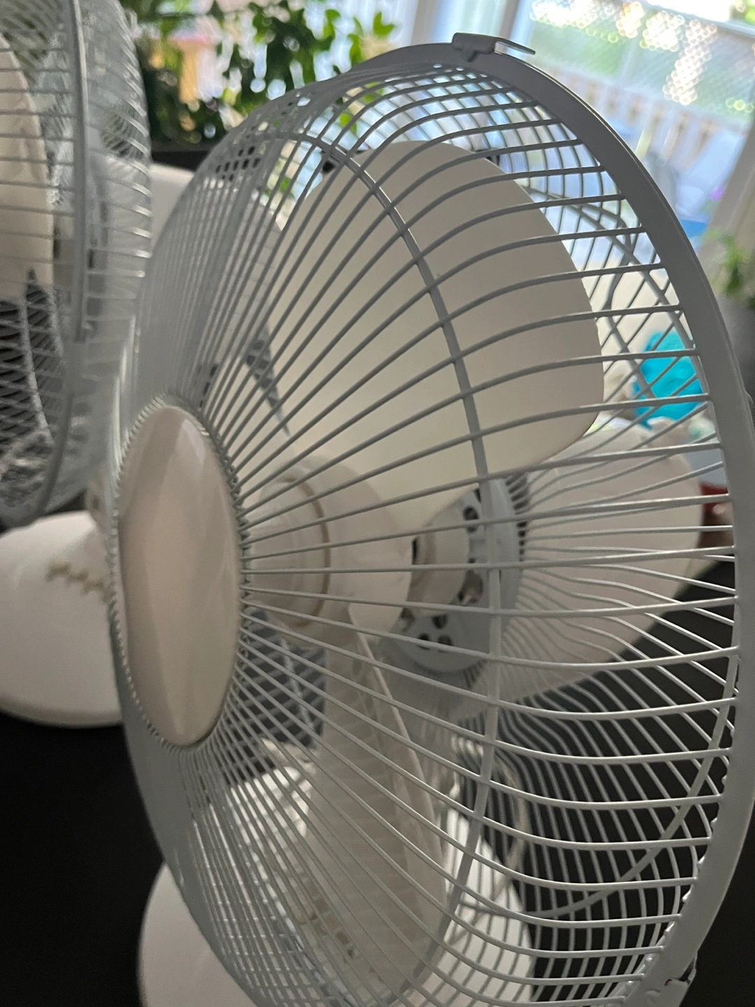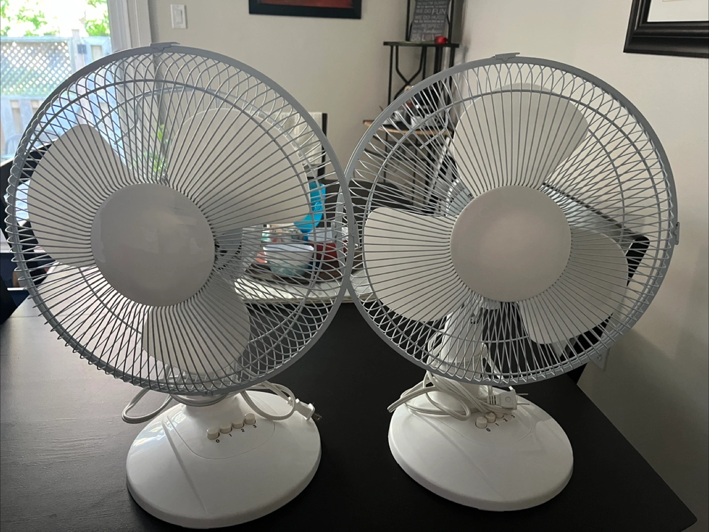 Selling one white table fan. It's in great shape and ready to keep you cool! Perfect for a desk, bedroom, or any small space that needs a little breeze - $10 - fan is larger than appears in photos