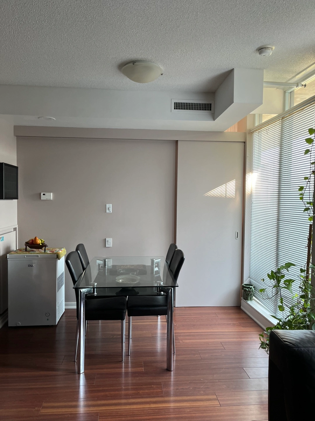 Selling a glass top dining table with four sleek black chairs. It's in great condition and would be a perfect addition to any dining space! Chairs have minor wear and tear on leather.