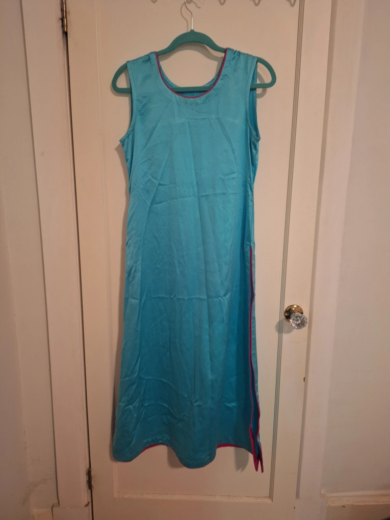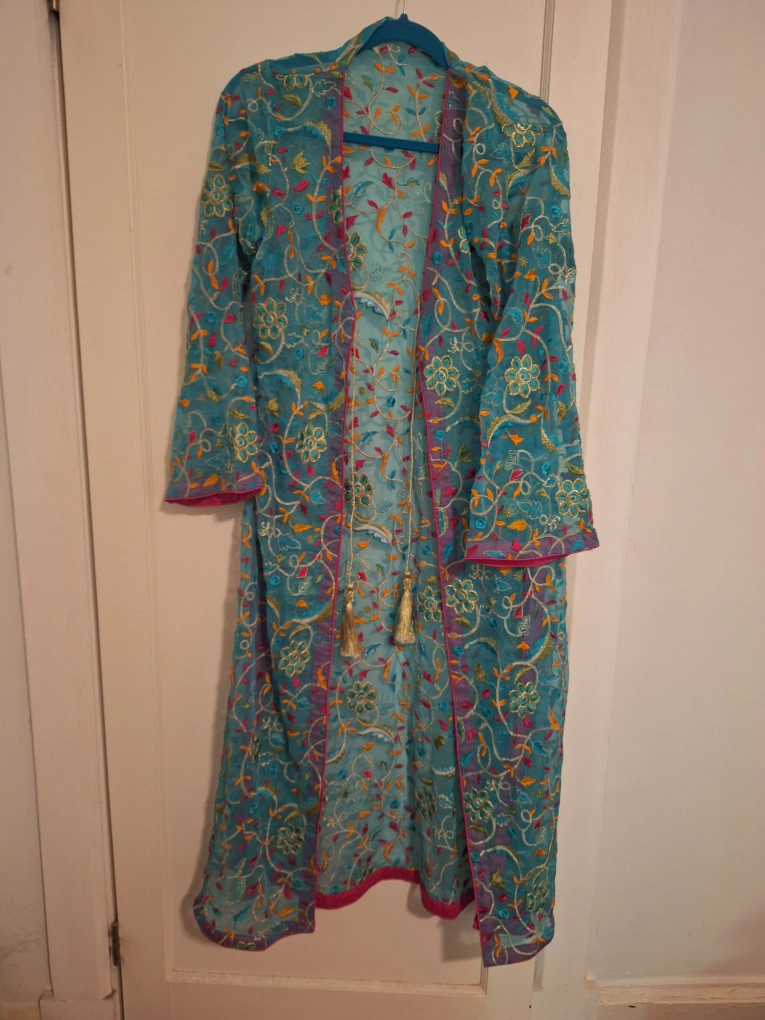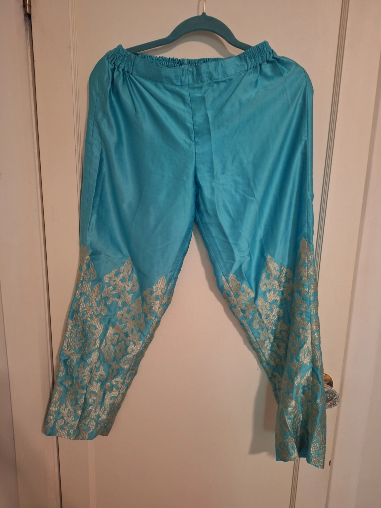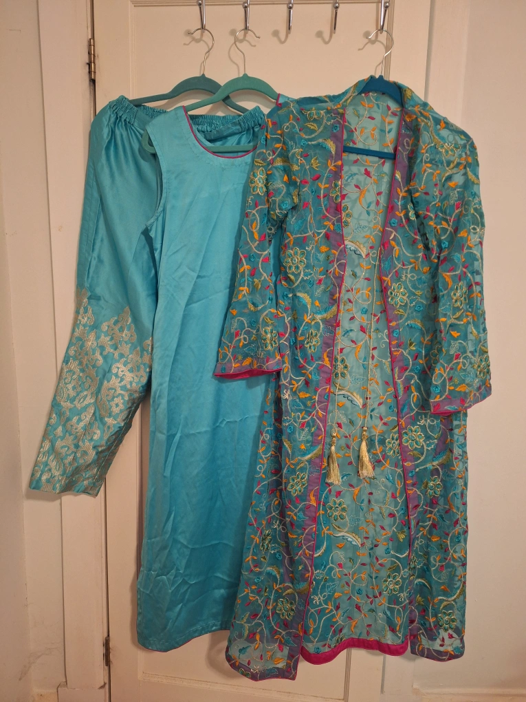 Selling a beautiful teal salwar kameez set! Includes a sleeveless kameez (long shirt), matching pants with gold embroidery, and a long, embroidered jacket. Perfect for special occasions or adding a pop of colour to your wardrobe!