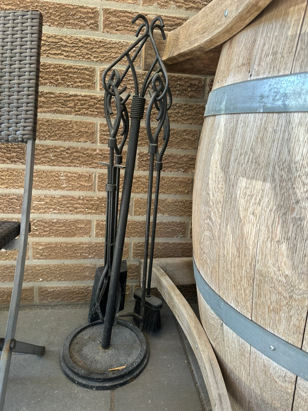 Selling a black metal fireplace tool set. It includes a stand, poker, shovel, and broom. Perfect for keeping your fireplace tidy and safe!