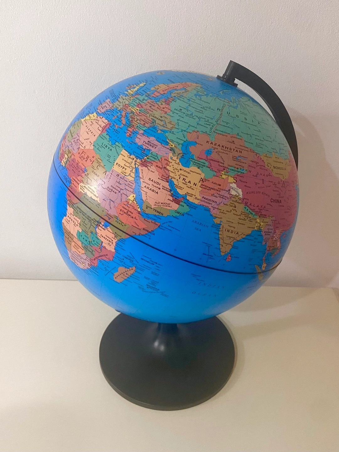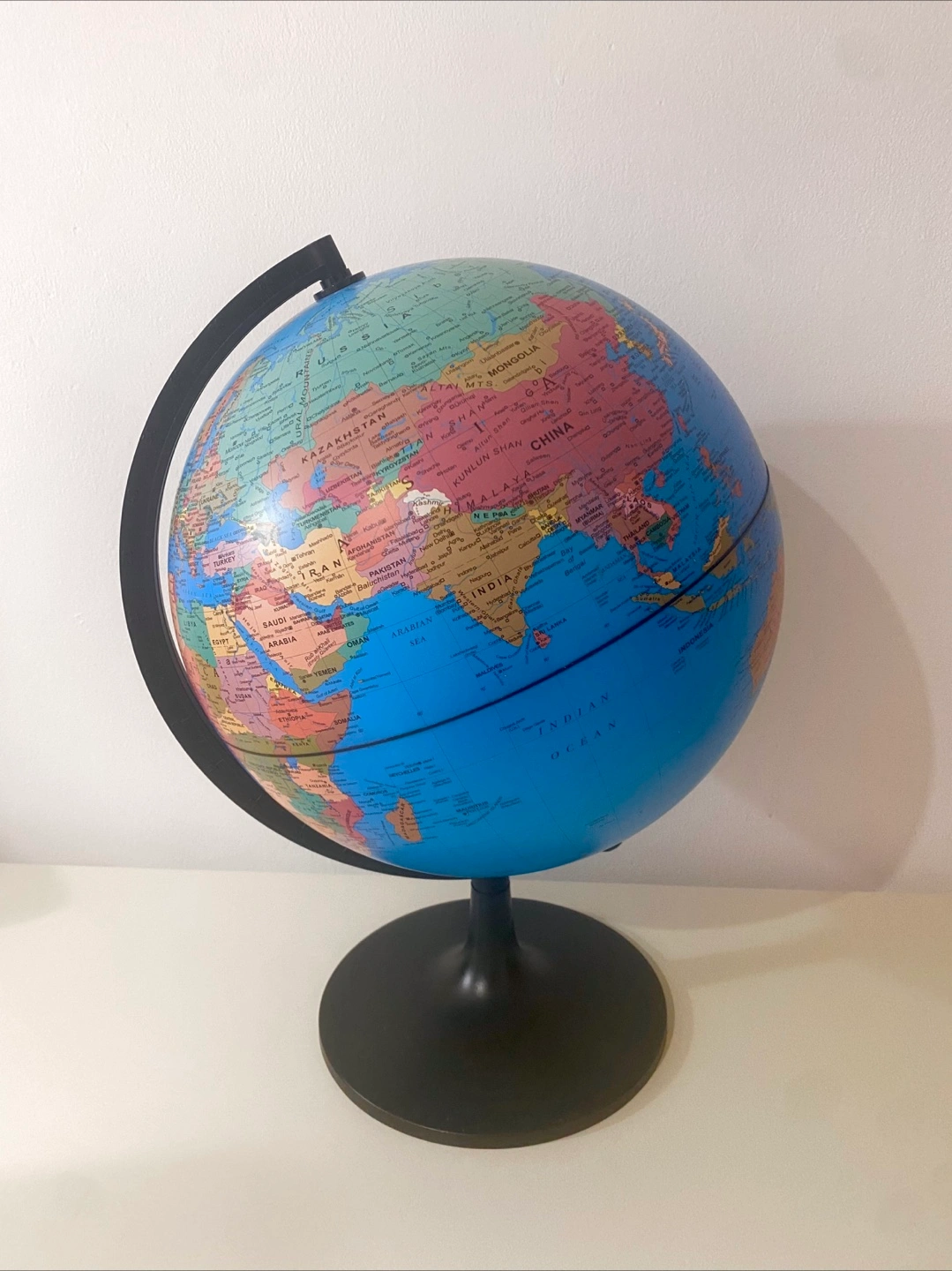Colourful, detailed rotating world globe. Easy to read with distinct colouring. Great for homes, offices, and classrooms. No damage, like new.