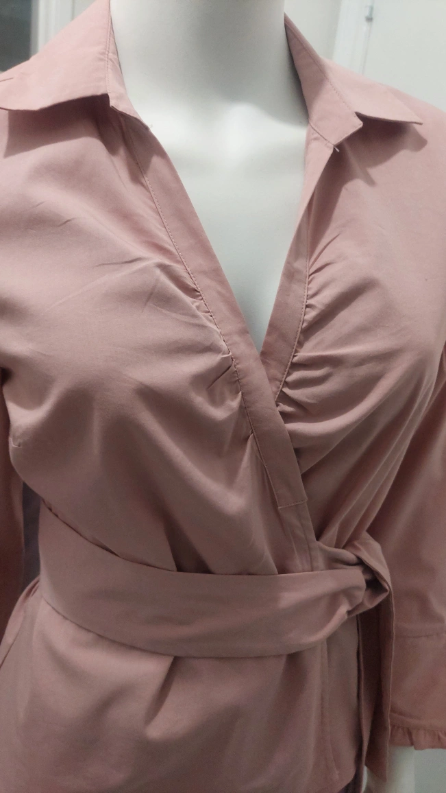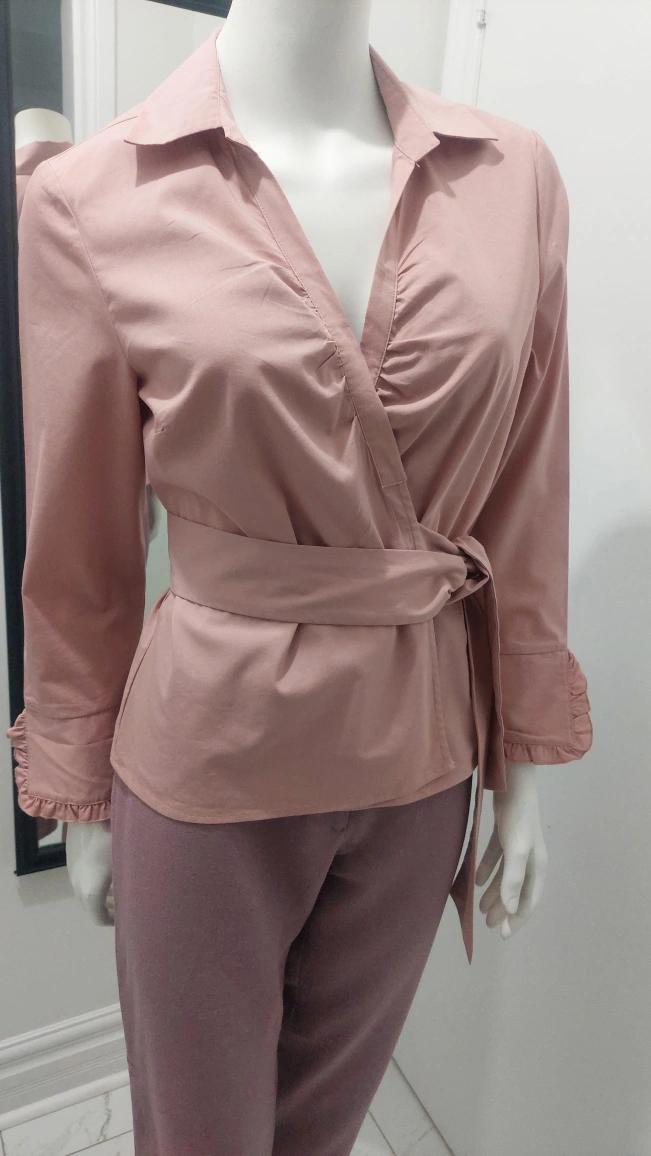 Brand new lovely rose pink wrap blouse! It features a flattering wrap design with a self-tie belt to cinch the waist. The blouse has a collared neckline and 3/4 sleeves with ruffle detailing at the cuffs. Perfect for adding a touch of elegance to your wardrobe! Add to bundling for an additional discount. Thank you for visiting my listings 🤝☺️