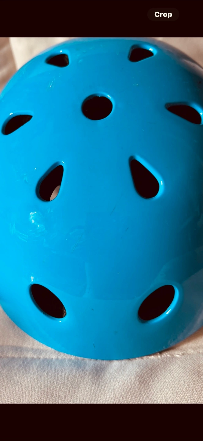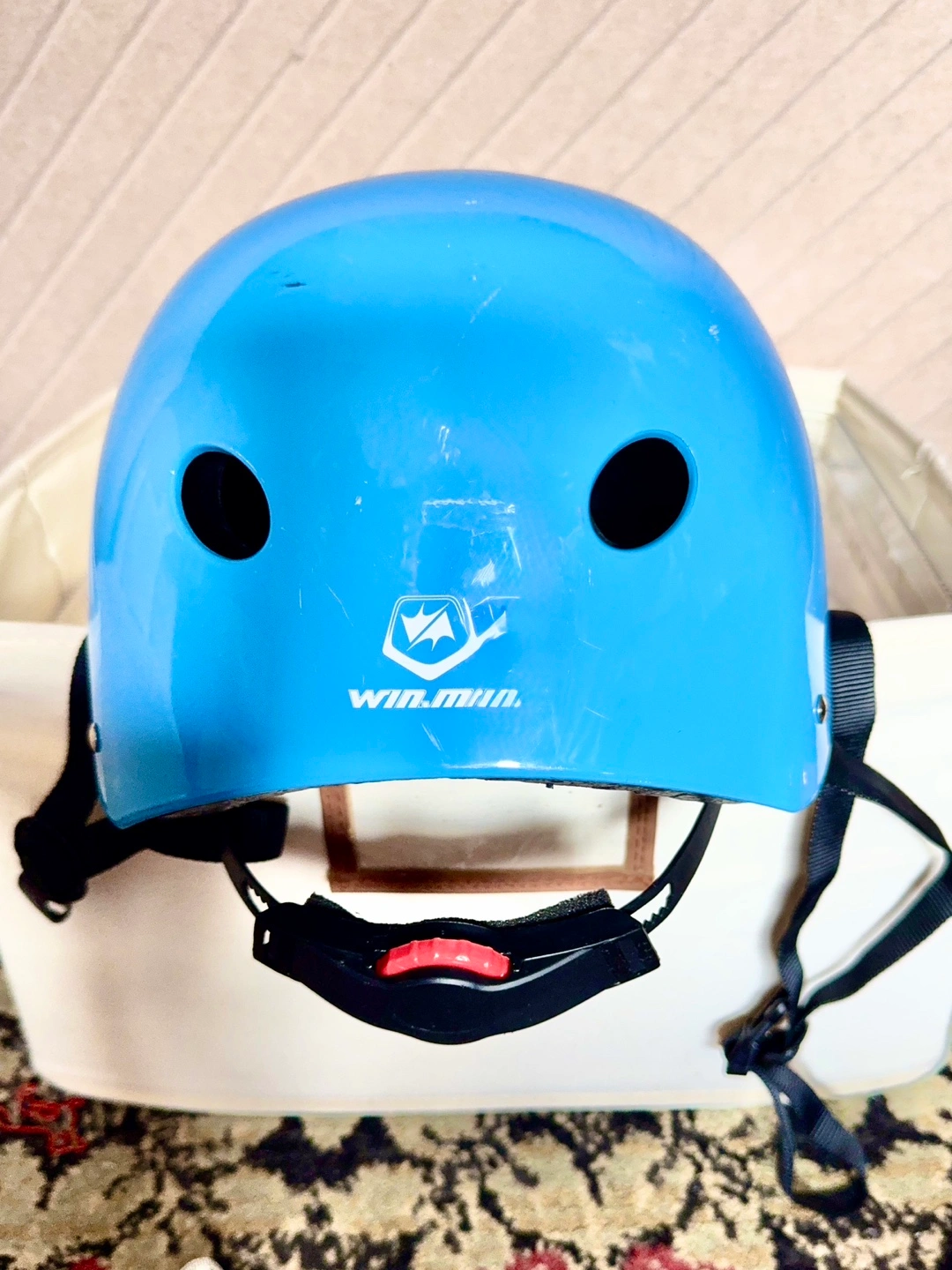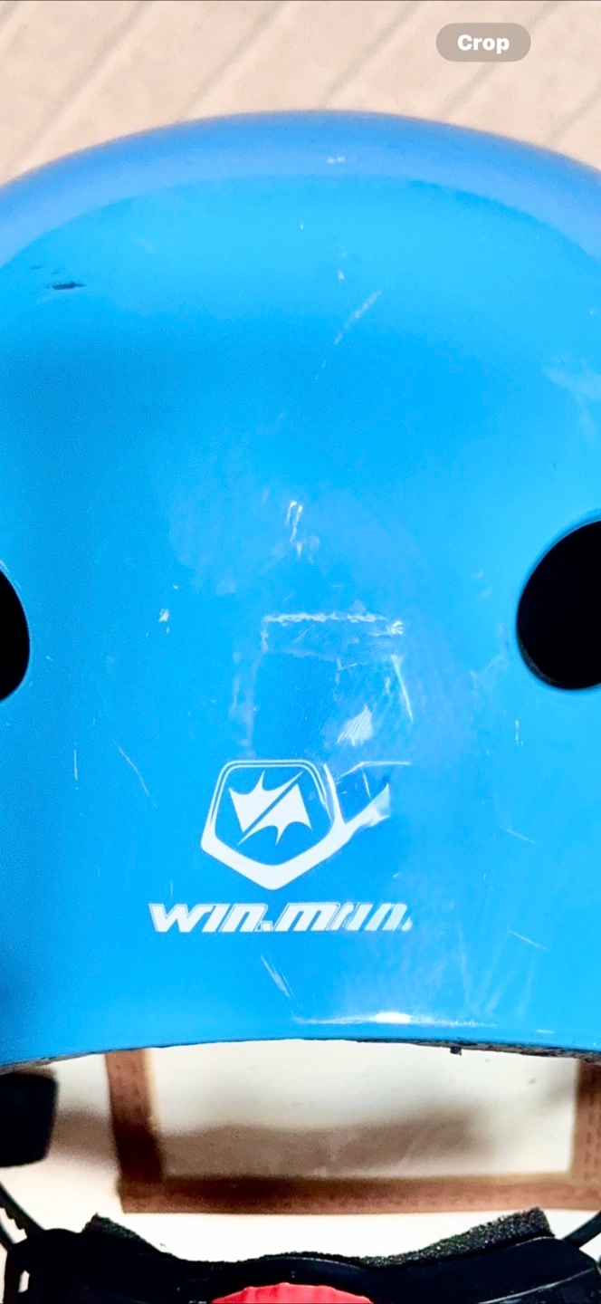 Here's a blue helmet from Win.Min. It has some scratches on the surface, but it's still in good working condition and ready for use! My daughter wore this at age 4. But can fit older kids.