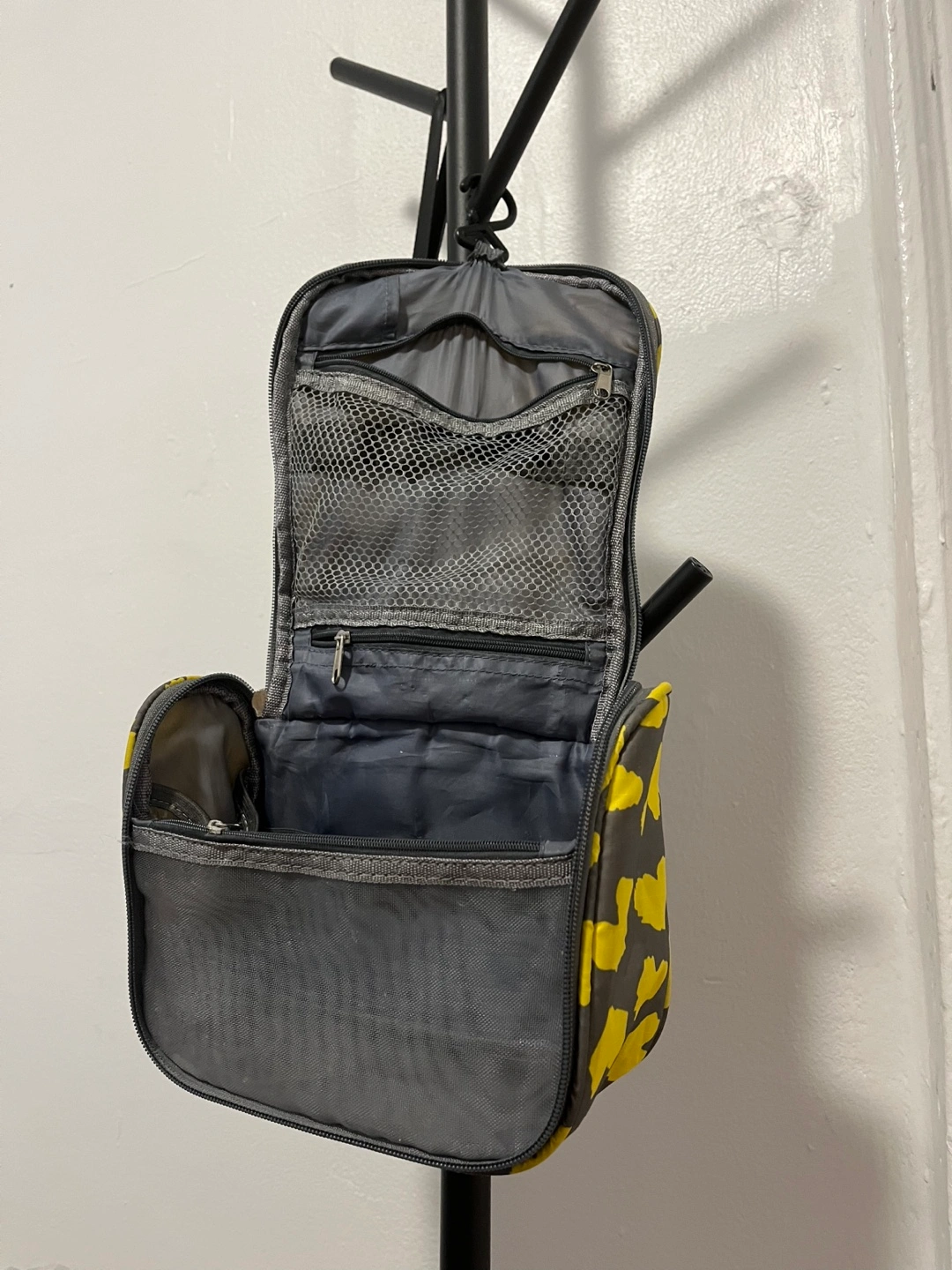 A convenient hanging travel toiletry bag! It features a yellow and gray heart pattern on the outside and a gray interior. Perfect for keeping your toiletries organized on the go
