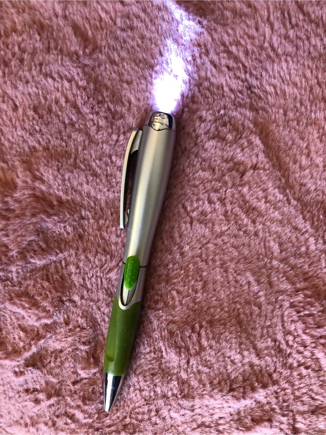 This is a pen with a built-in light. Black ink. It's in good condition and ready for a new home. Great for low light conditions or when on the road.