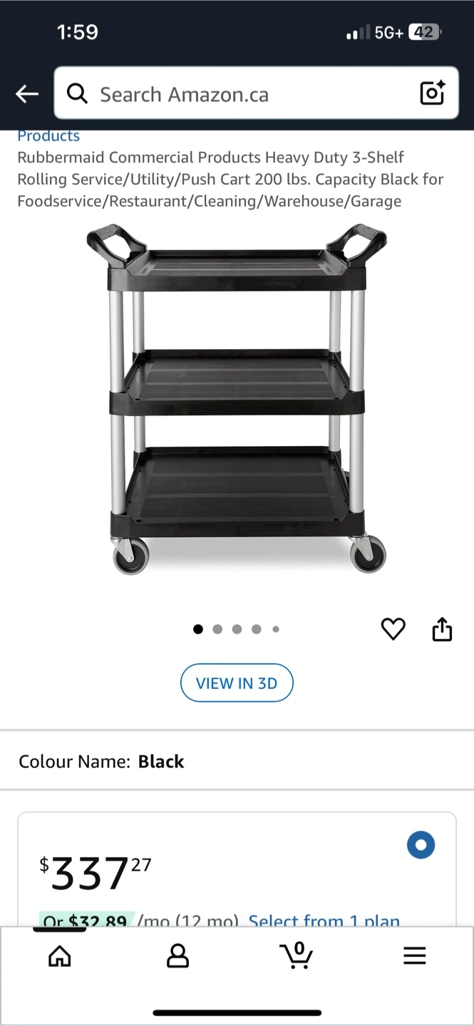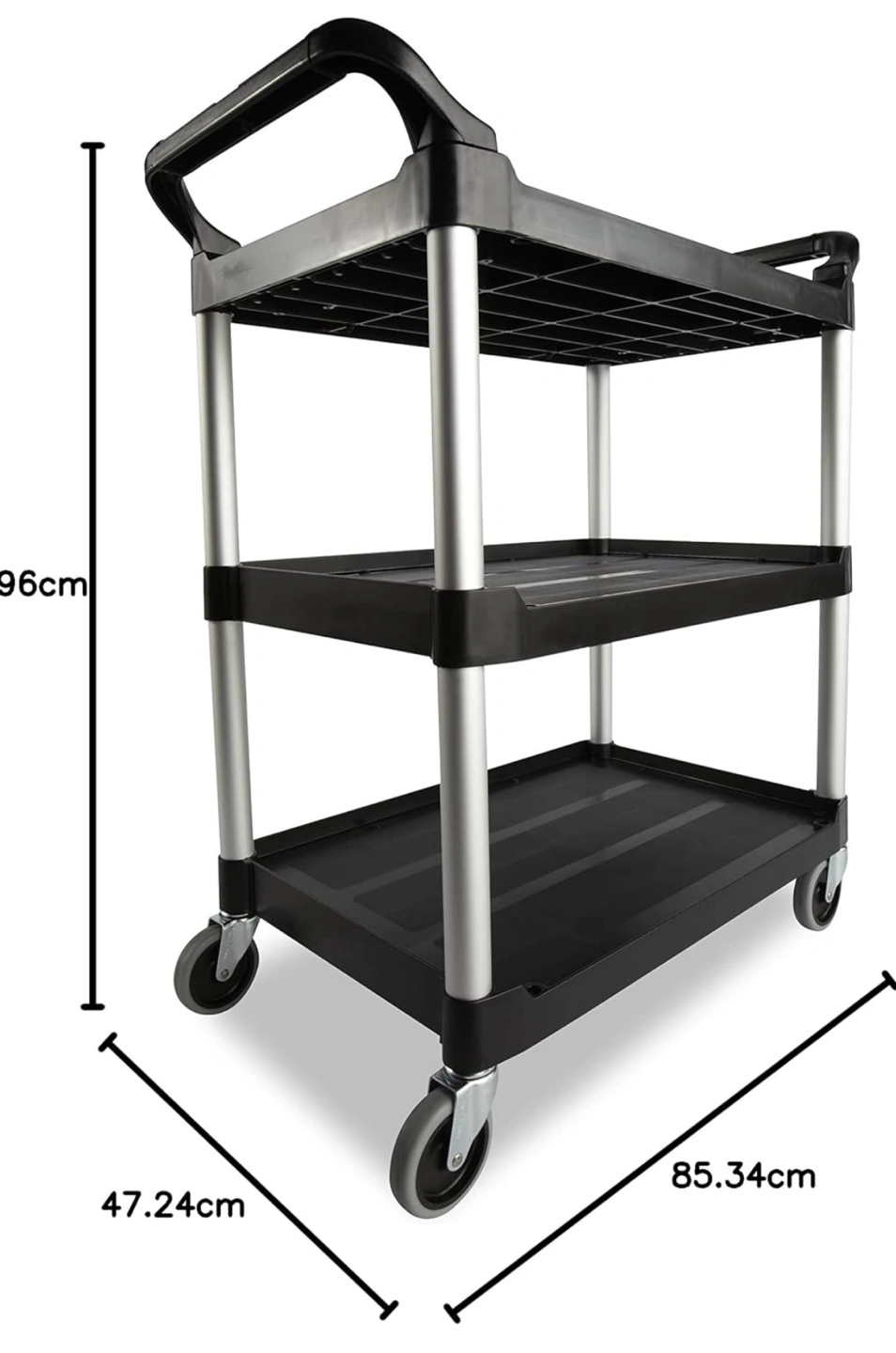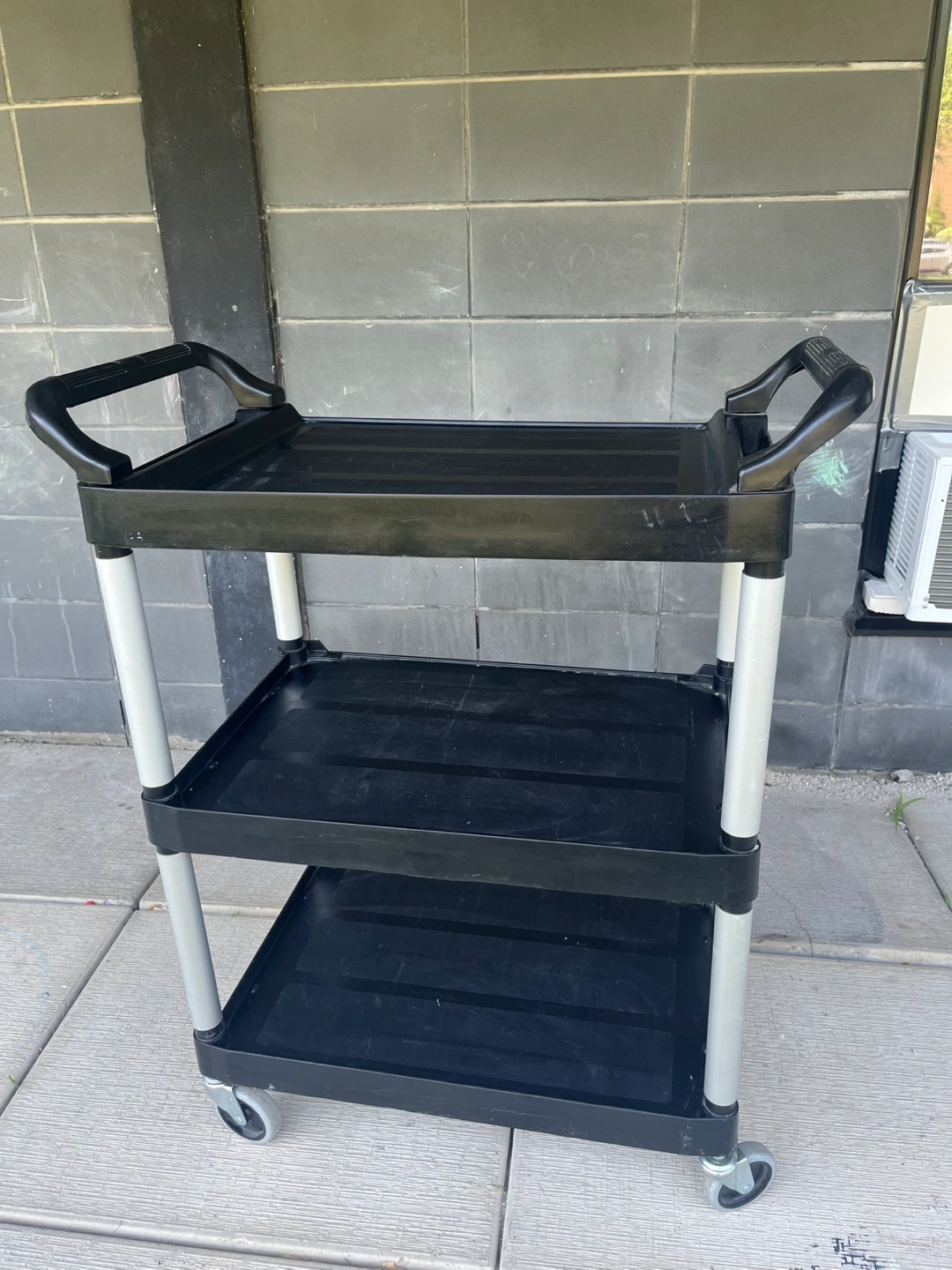 Selling a Rubbermaid Commercial Products heavy-duty 3-shelf rolling service cart! It's black and has a 200 lbs capacity. Great for foodservice, restaurants, cleaning, warehouse, or garage use
