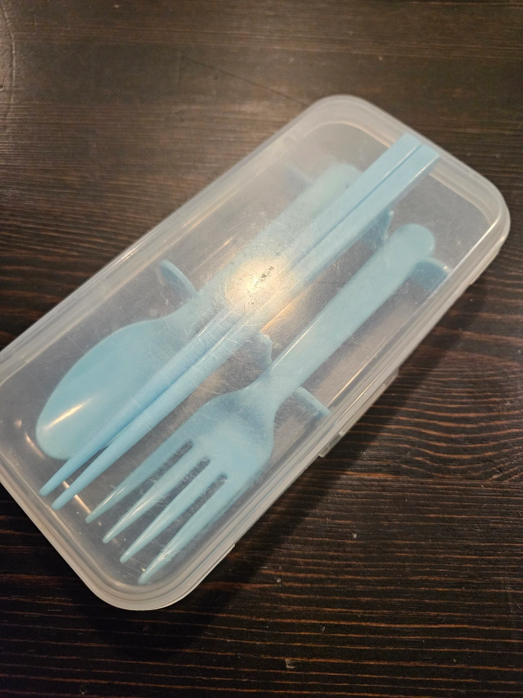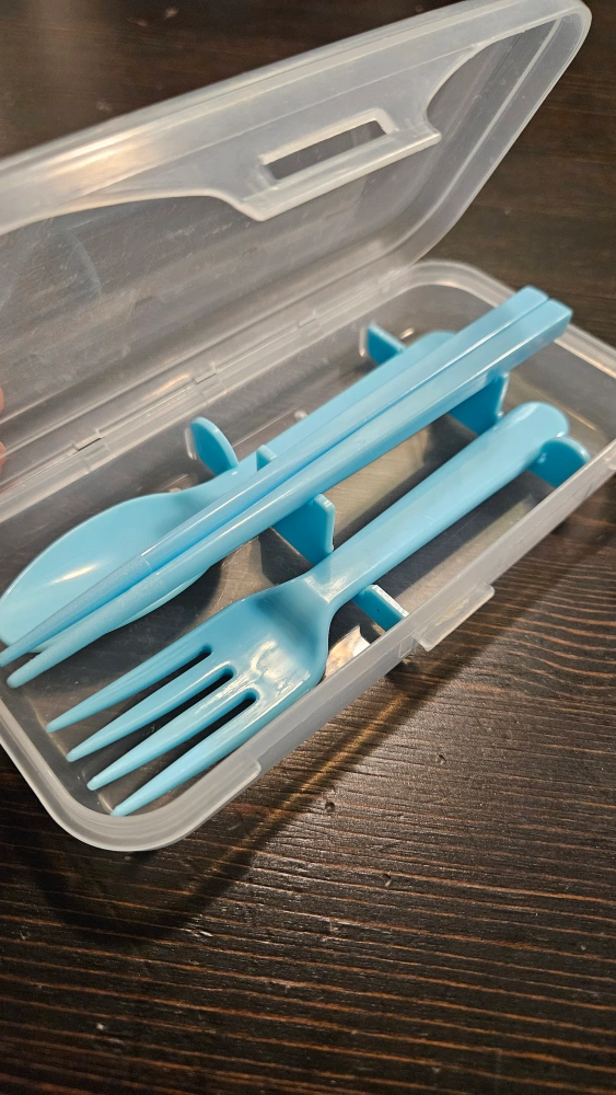 Here's a handy reusable cutlery set in a light blue colour, perfect for taking lunch to work or school. It includes a fork, spoon, and chopsticks, all neatly stored in a clear plastic case. Great for reducing waste!