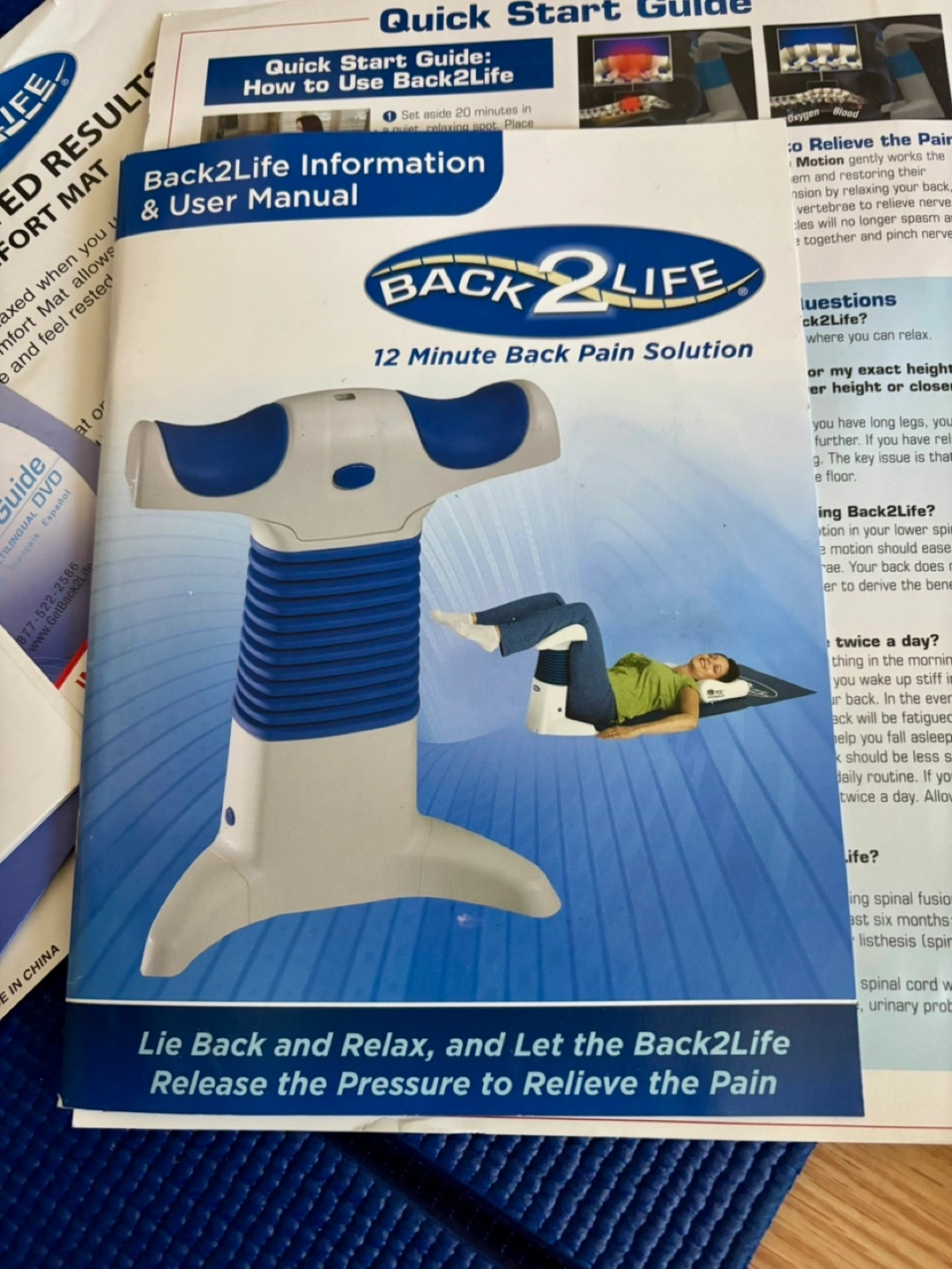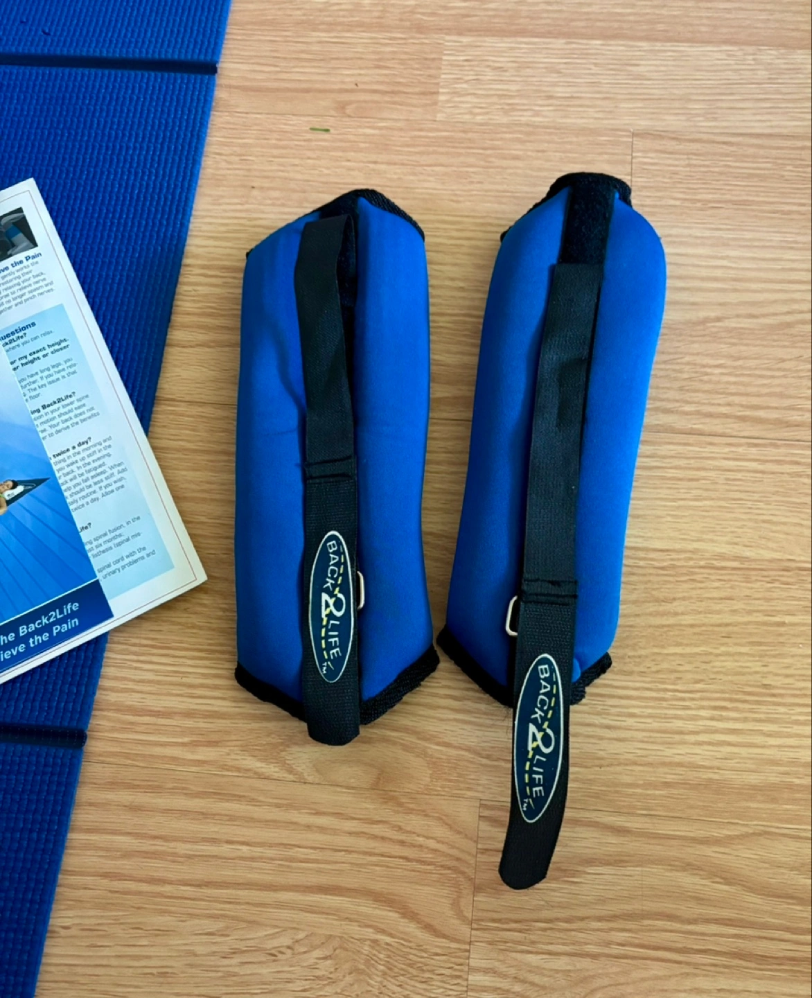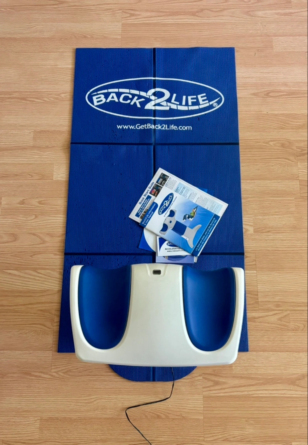 Get relief from back pain with the Back2Life system! This system includes the Back2Life device, a mat, and ankle weights to help you relax and release pressure on your spine. It also includes a Quick Start Guide and User Manual.