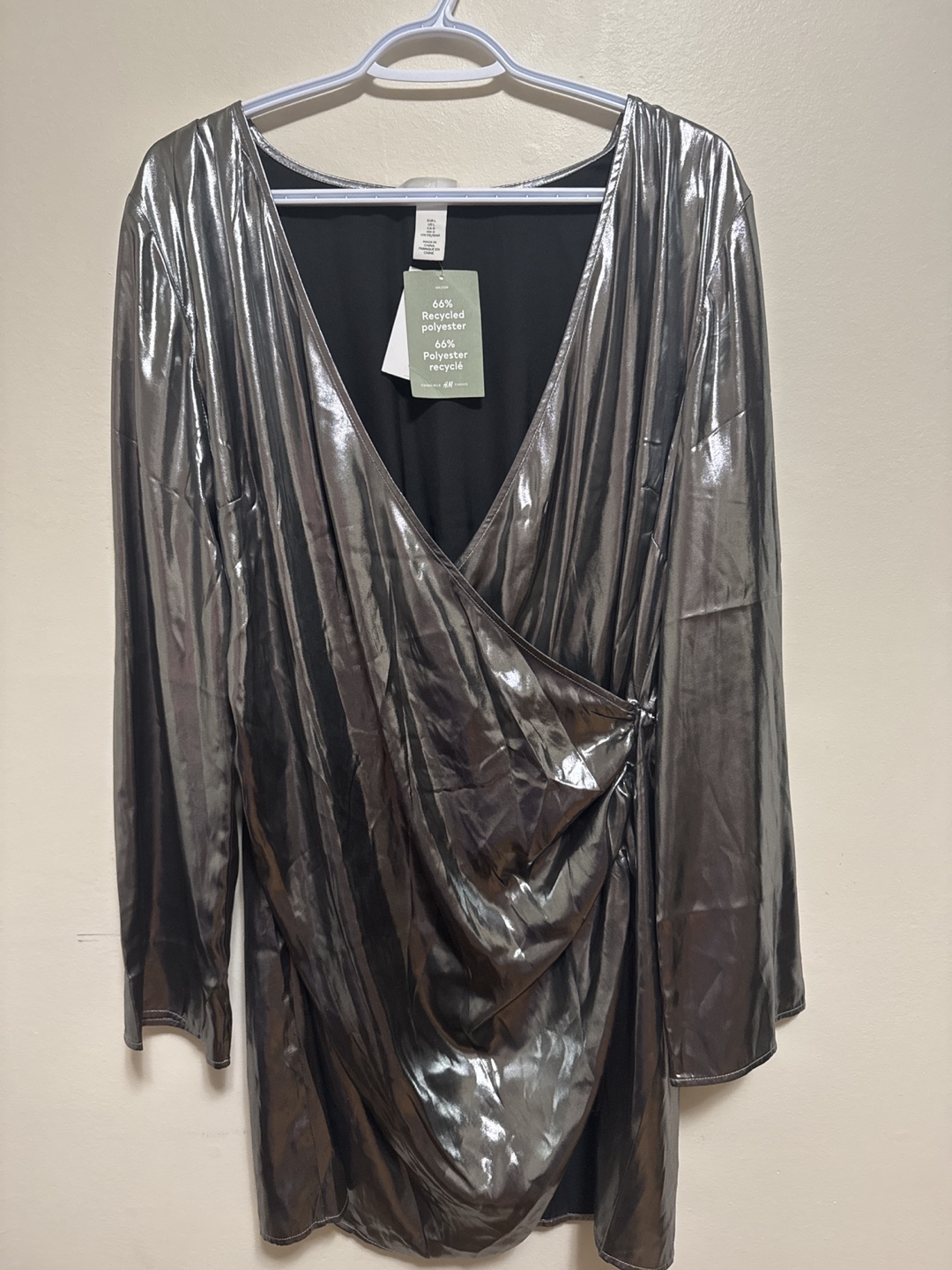 Selling a stylish silver dress from H&M in size medium! It's made with 66% recycled polyester, making it a sustainable choice for your wardrobe