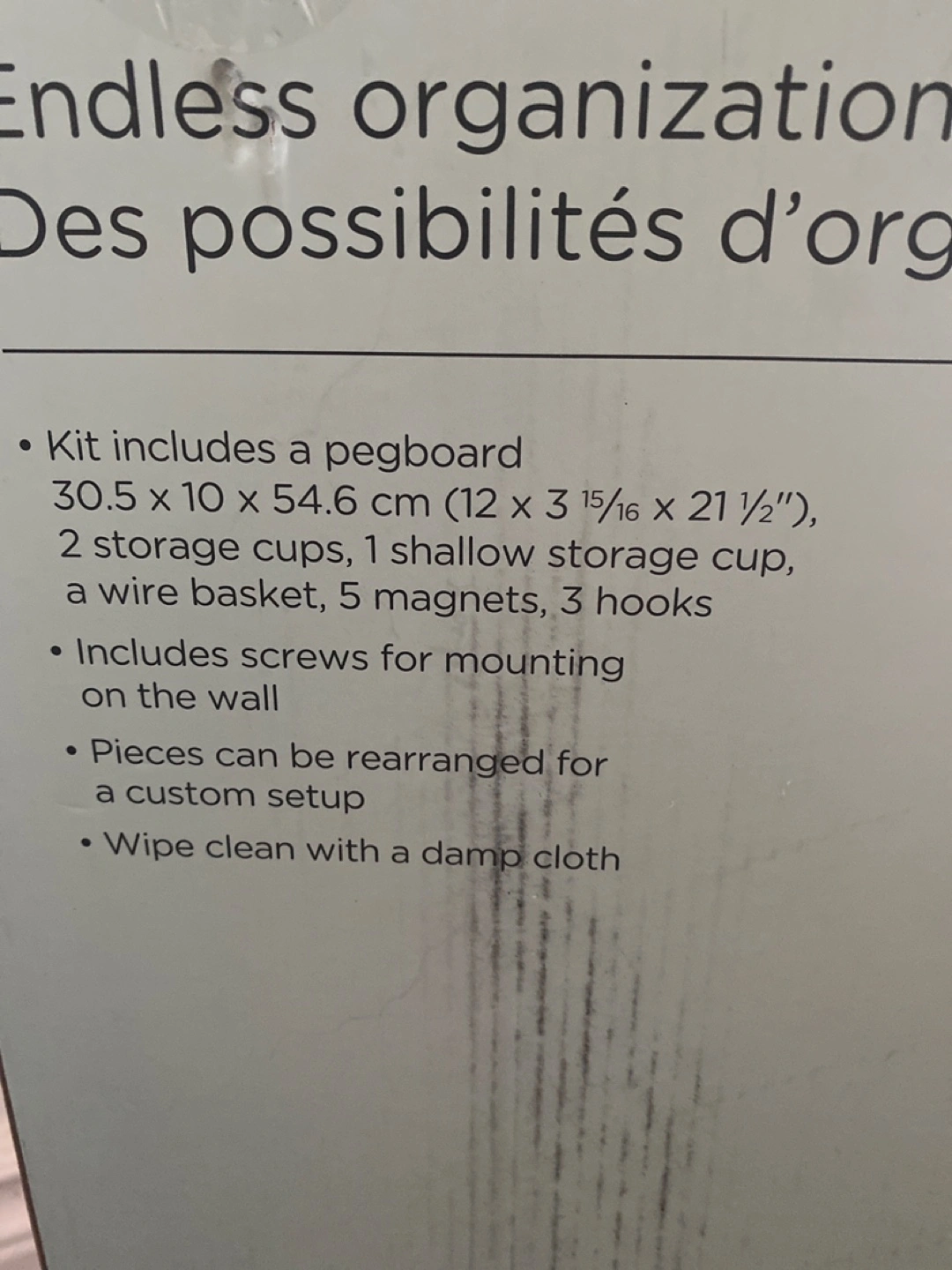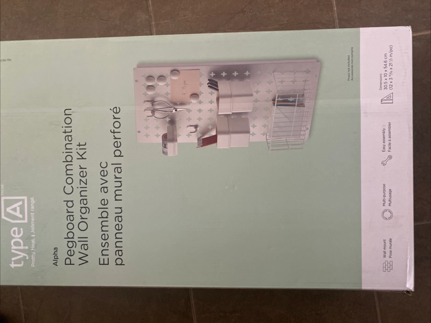 Get organized with this Type A pegboard combination wall organizer kit! The kit includes a pegboard, 2 storage cups, 1 shallow storage cup, a wire basket, 5 magnets, and 3 hooks. It also includes screws for mounting on the wall. The pieces can be rearranged for a custom setup. The dimensions are 30.5 x 10 x 54.6 cm (12 x 3 15/16 x 21 1/2")