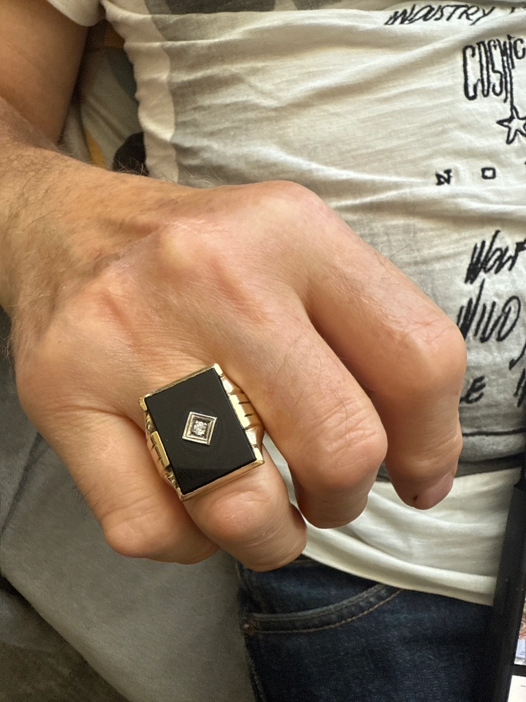 153Selling a vintage ring featuring a black onyx stone and a small diamond. The ring is yellow gold in colour and weighs approximately 10.3 grams. Size 10.5 US Selling this ring for a family member. ⚠️LOWBALL OFFERS BLOCKED⚠️
