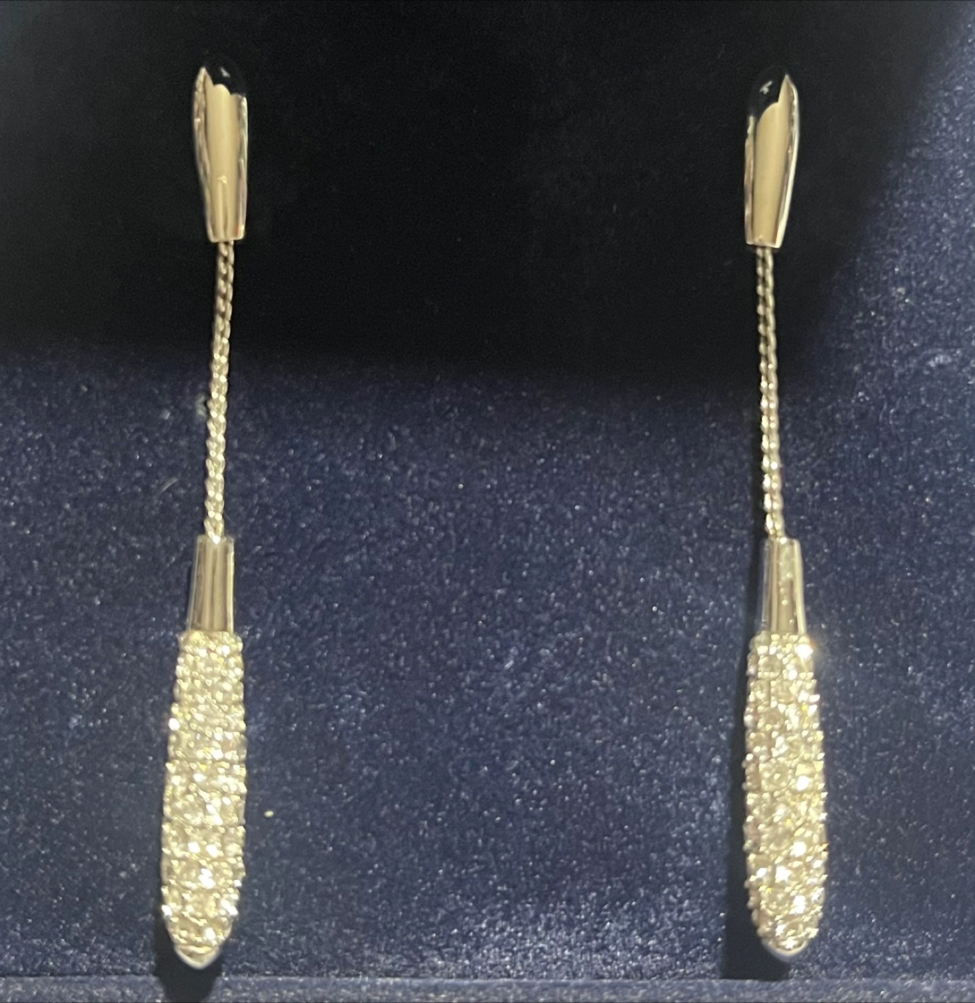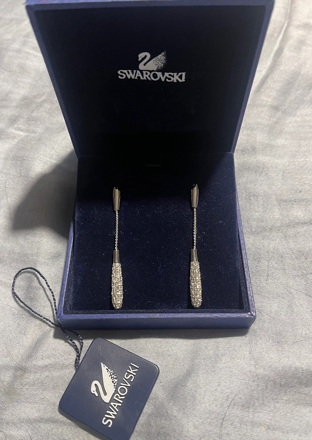 Elegant, long drop earring. Silver metal construction. Feature a row of sparkling Swarovski embellishments. Perfect for dressing up any outfit.