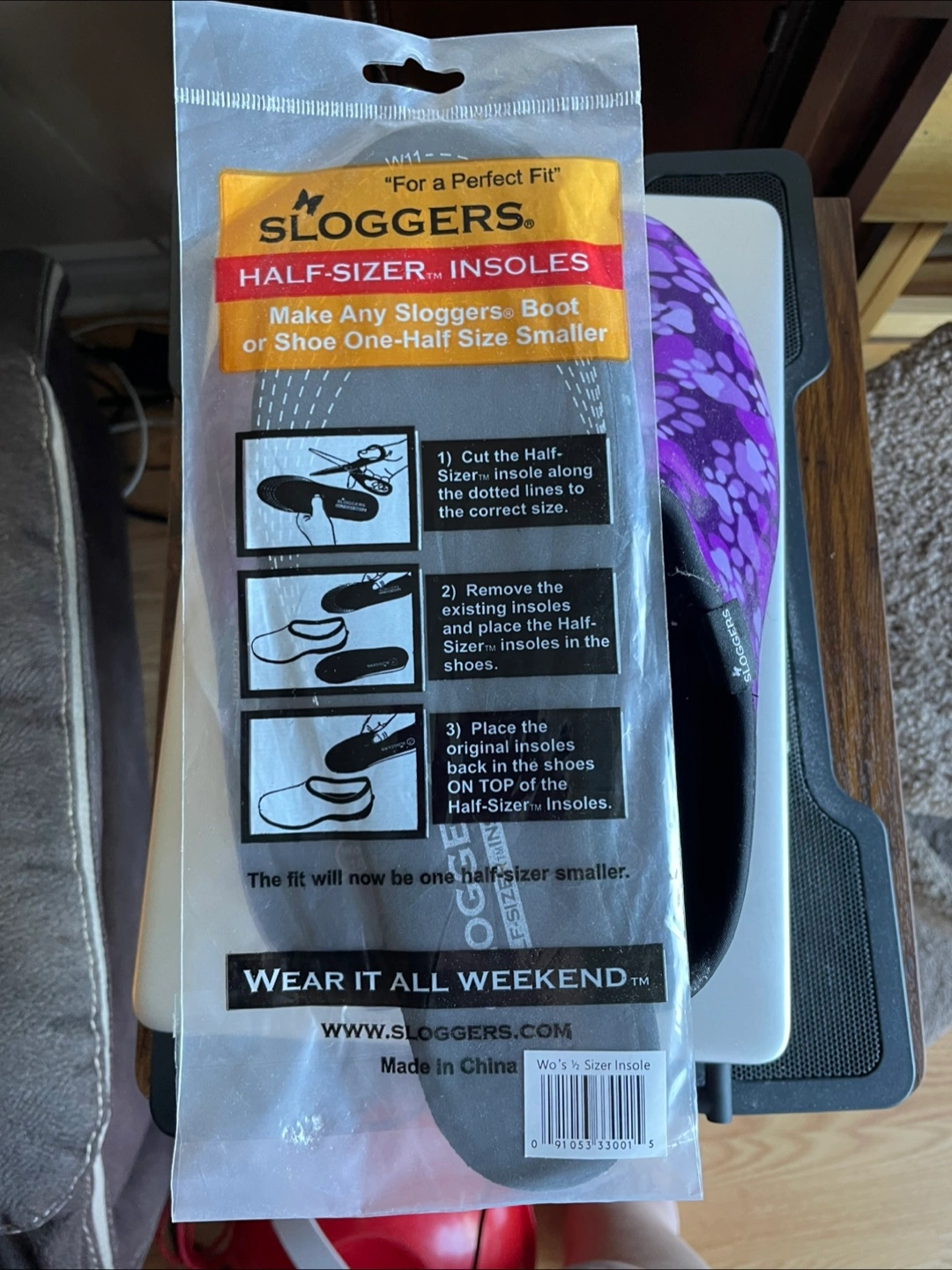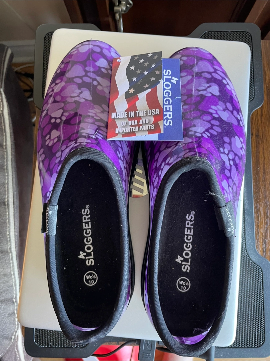 64Sloggers Purple Rain garden shoes in women's size 10! These are great for gardening or just wearing around the yard. They come with half-sizer insoles to make any Sloggers boot or shoe one-half size smaller. Wear them all weekend!