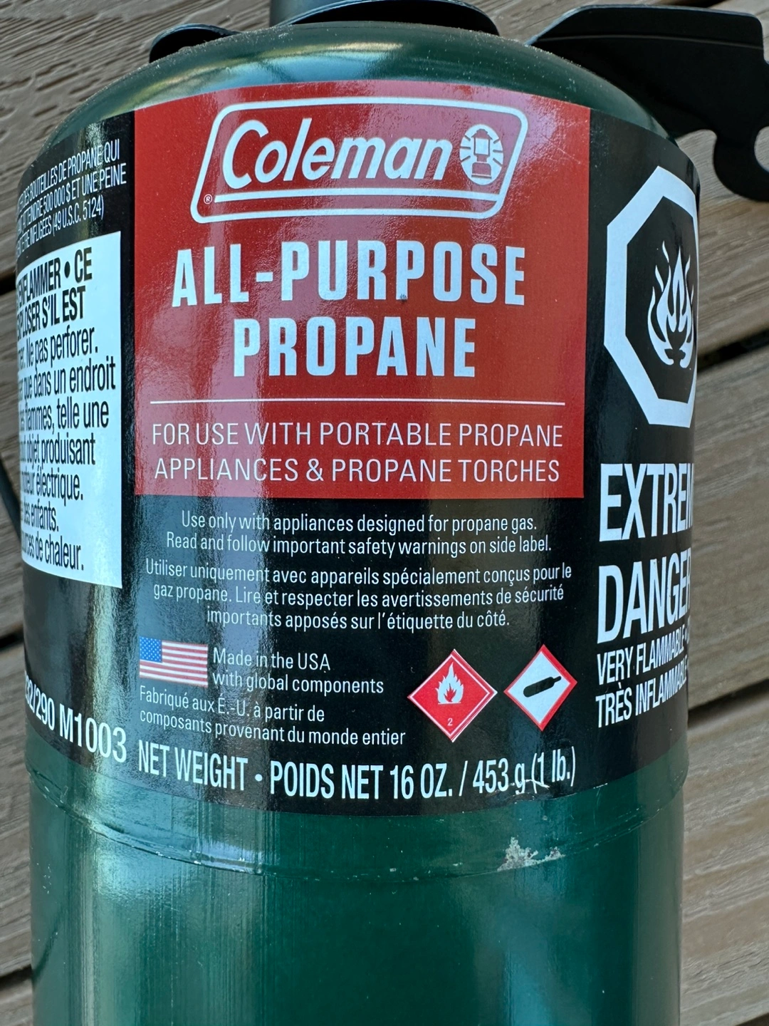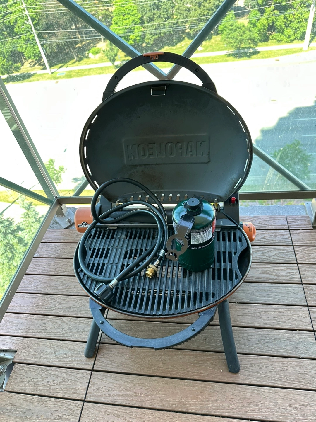 Portable gas/cast iron Grill + Gas pipe + Coleman gas can