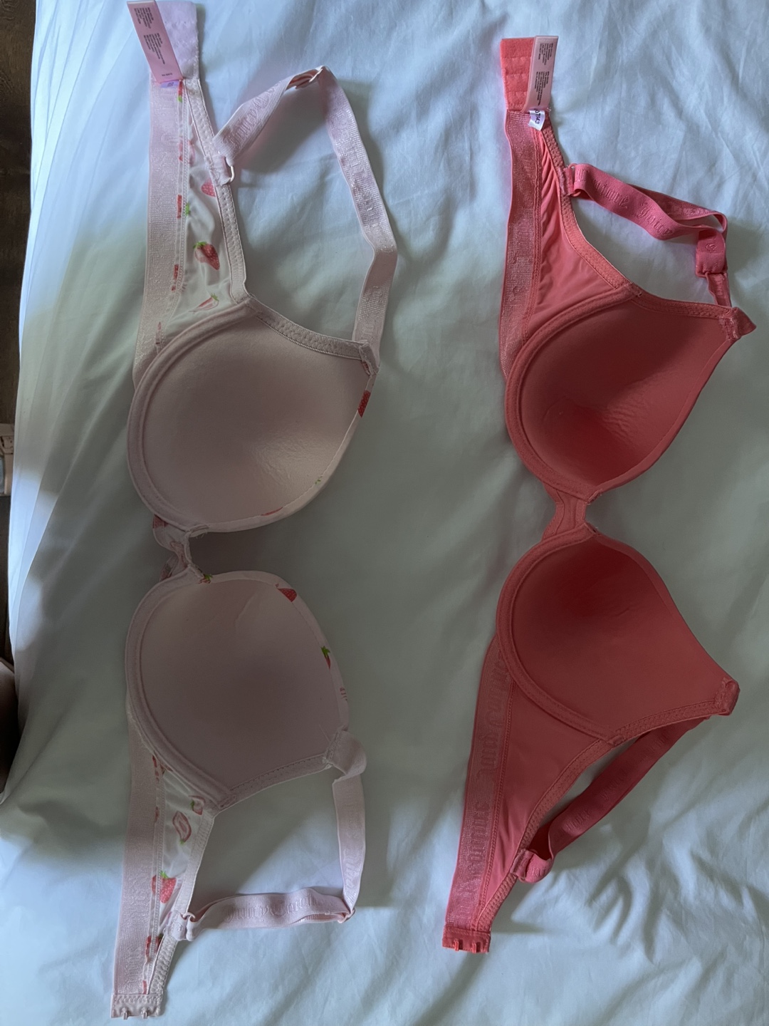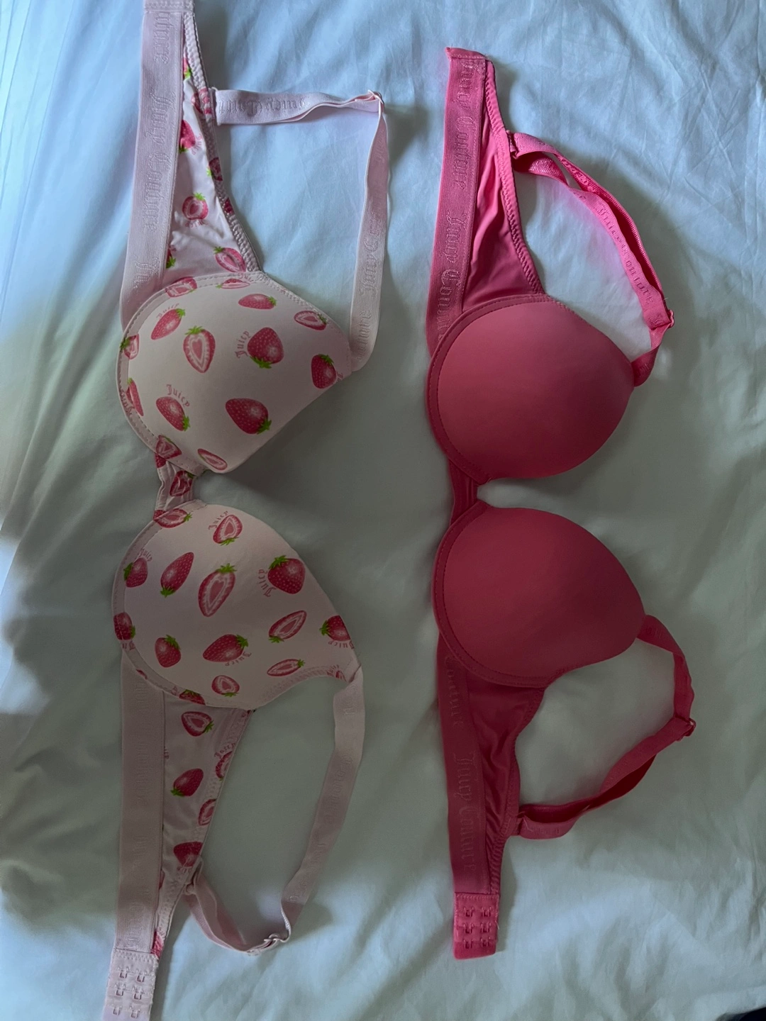 Two cute Juicy Couture push up bras up for grabs! One is a sweet strawberry print and the other is a solid pink colour. Both are in great condition as they were never worn.