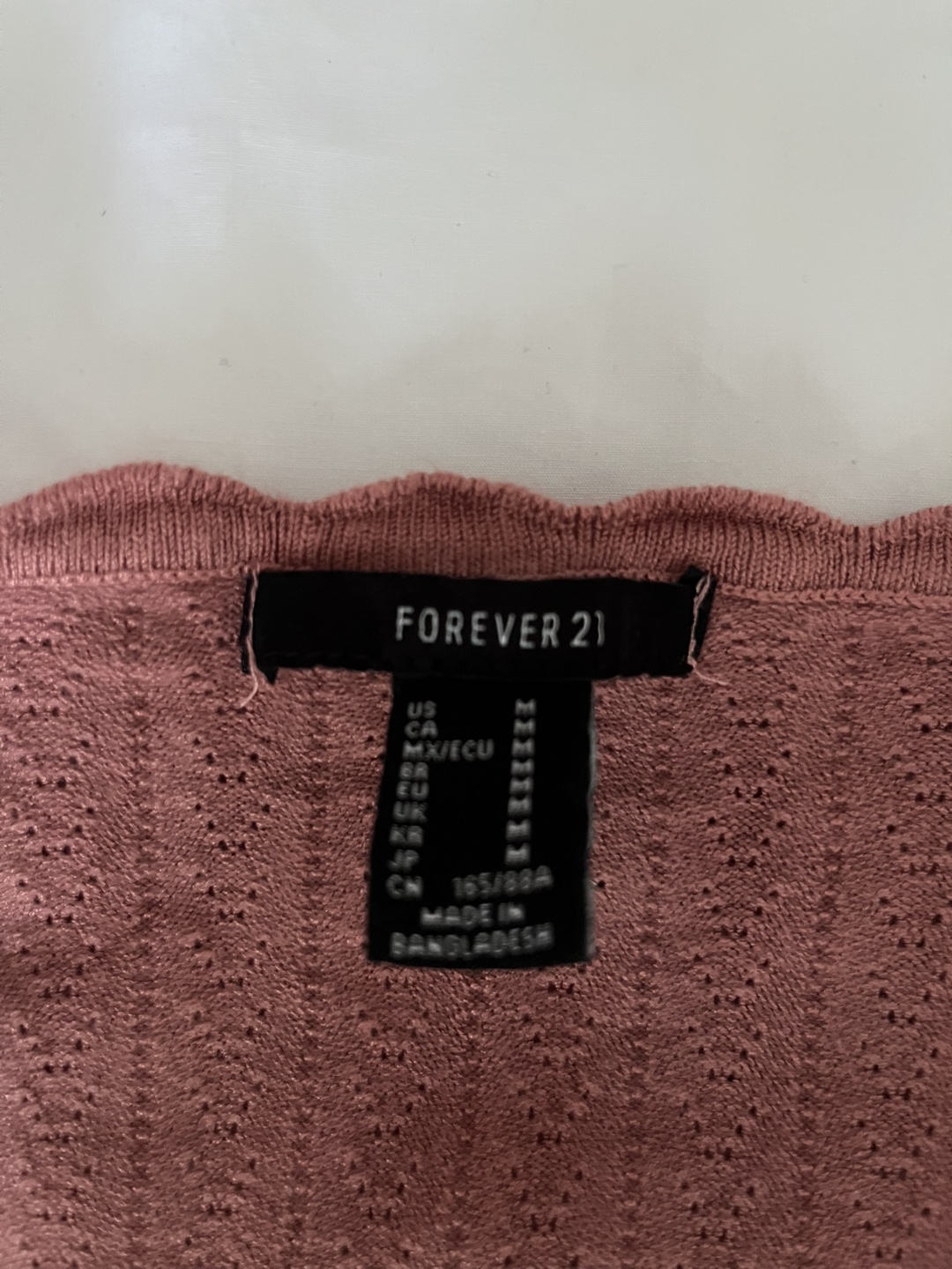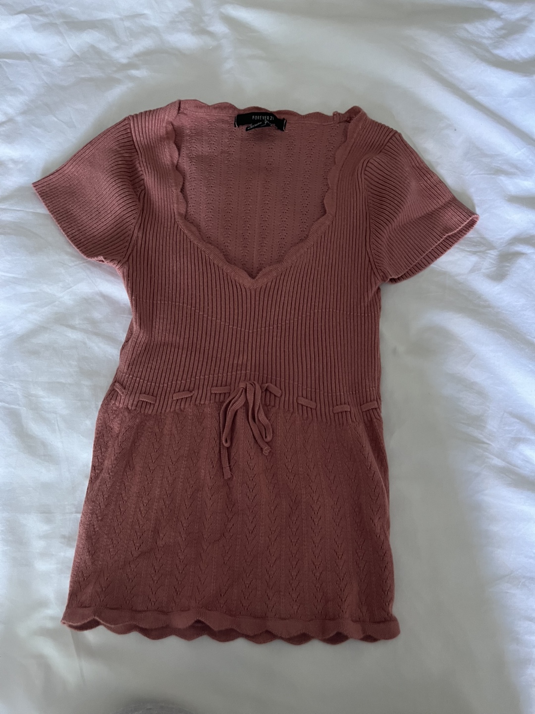 A cute Forever 21 knit top in size medium! It features a flattering v-neck and a drawstring waist. The colour is a lovely muted rose tone, perfect for everyday wear