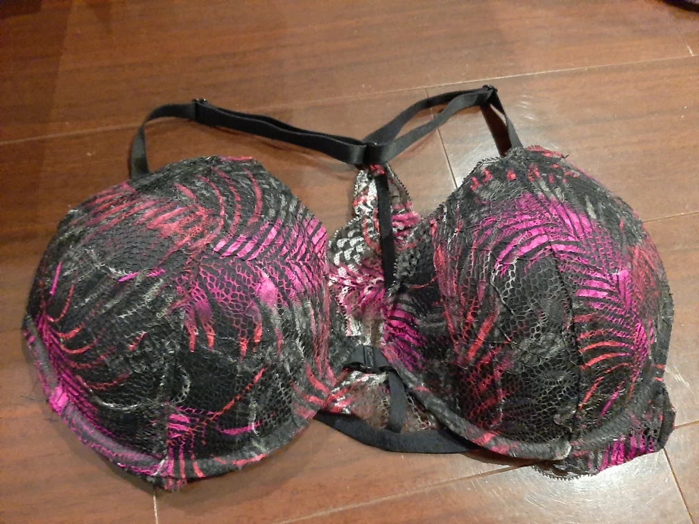 New Victoria's Secret racerback bra in size 36D! The bra features a black and pink lace design. It's in great condition and ready for a new home.