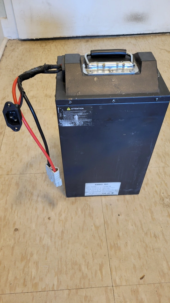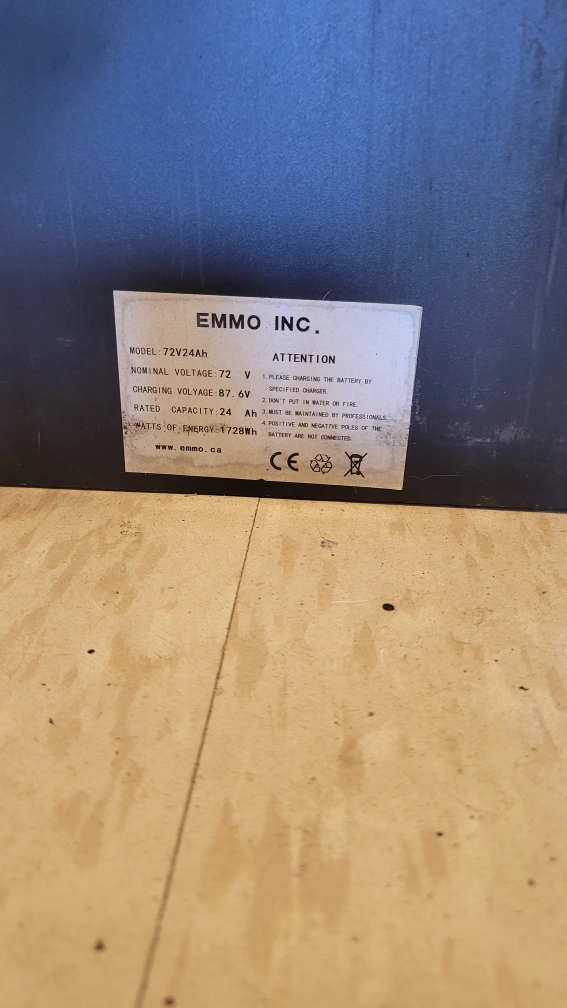Selling an EMMO INC. 72V24Ah Lifpo battery. It has a nominal voltage of 72V and a charging voltage of 87.6V. The rated capacity is 24Ah, with watts of energy at 1728Wh. Please use the charging by specified charger, and do not use in water or fire. The emergency charging activation port should only use a charger under 60V, and the charging time is less than 10 minutes. Do not use this port for daily charging. It's in excellent condition and is standing by at 79.8. I will charge it fully for the potential buyer. ● NOTE: DOES NOT COME WITH CHARGER ●.