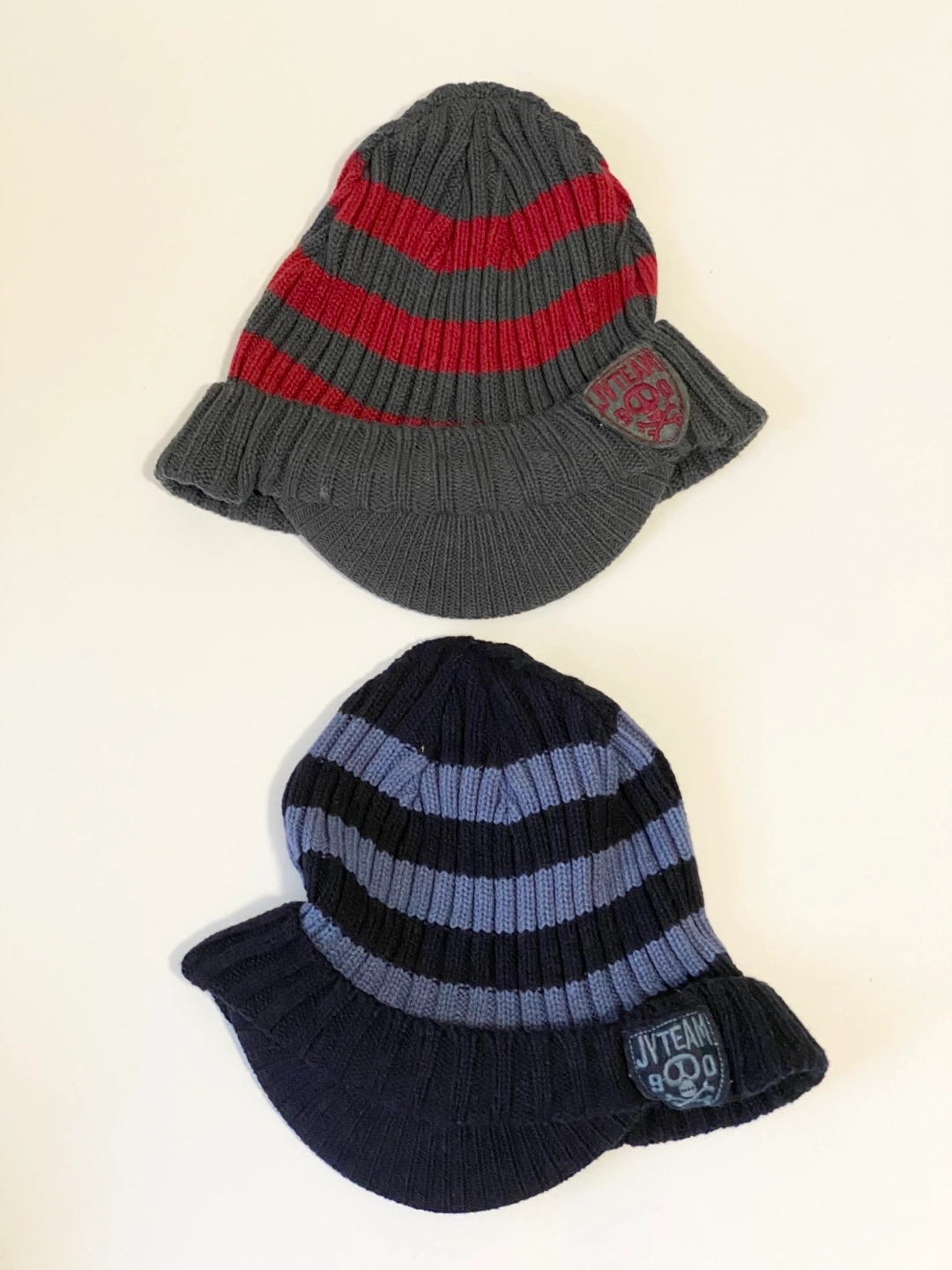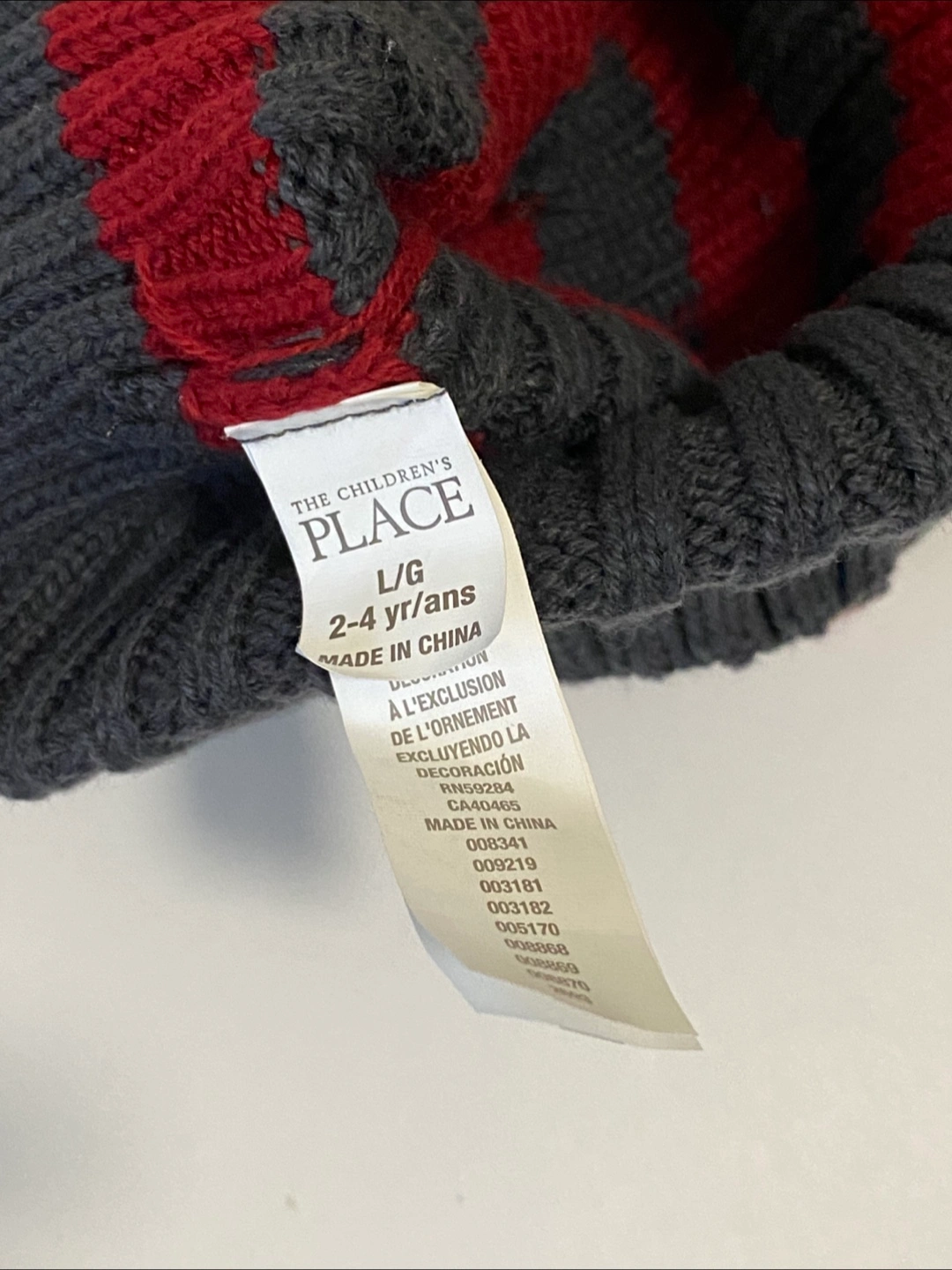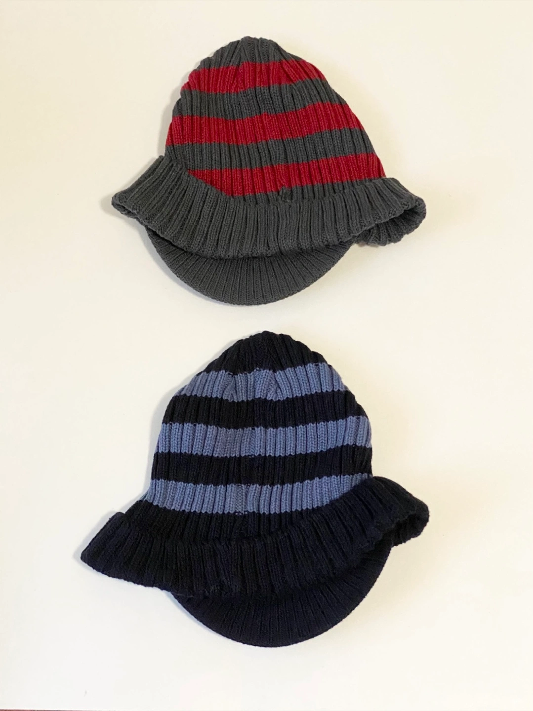 Two cute hats from The Children's Place! One is grey with red stripes, and the other is navy with blue stripes. They're sized L/G, suitable for 2-4 year olds. The material is 60% cotton and 40% acrylic, so they're nice and cozy for your little one.