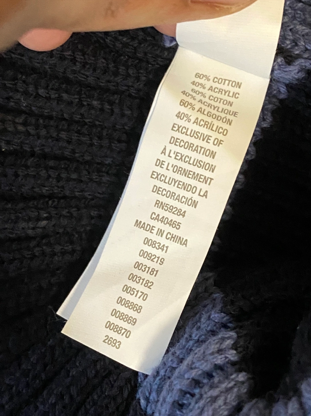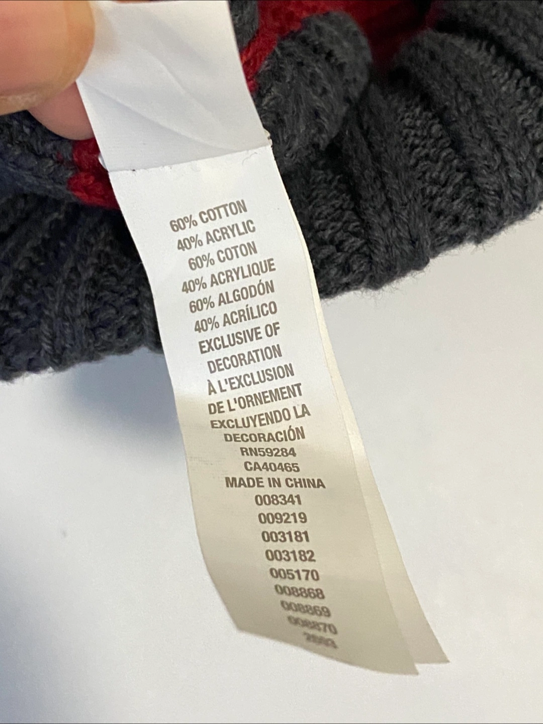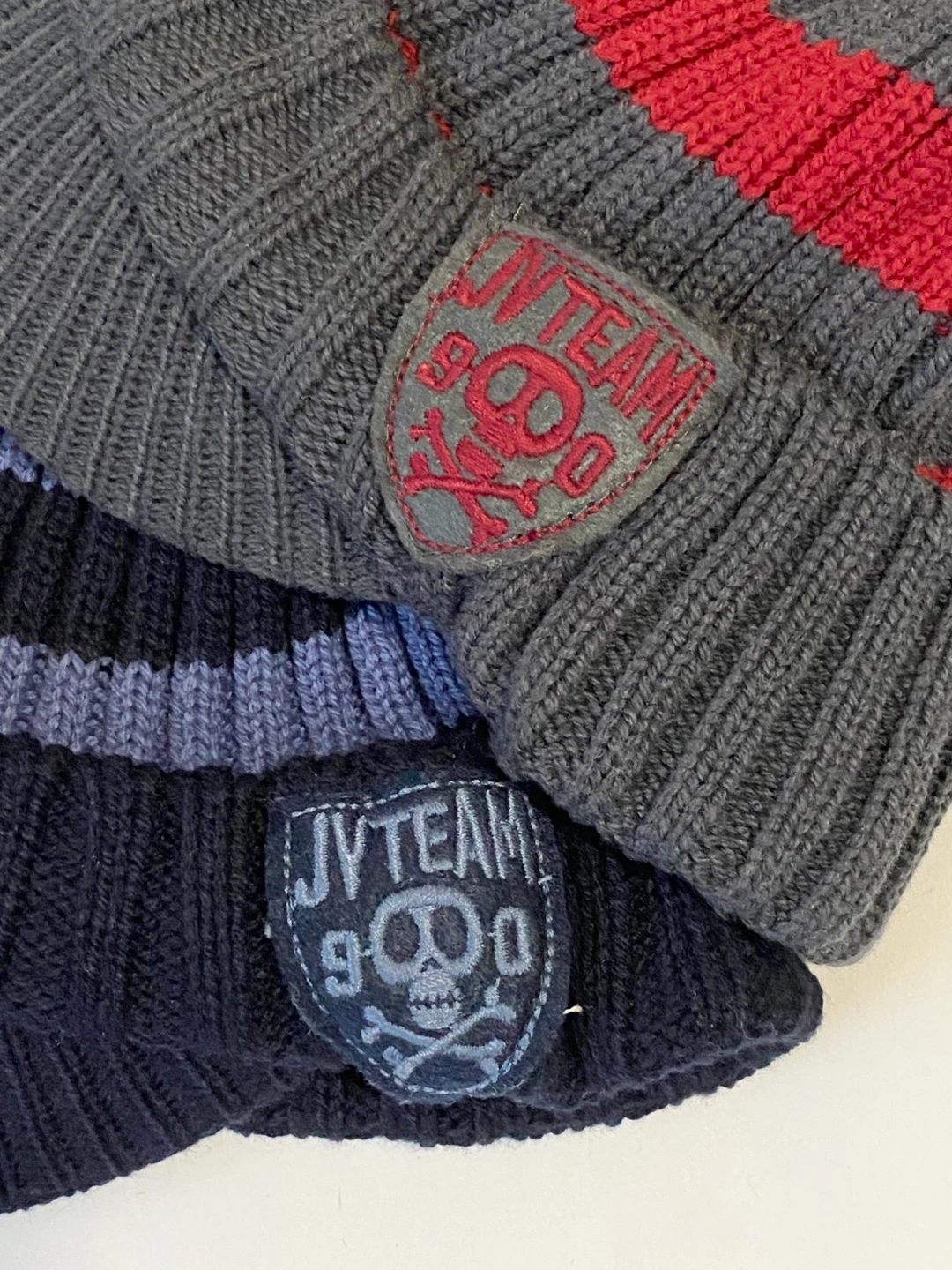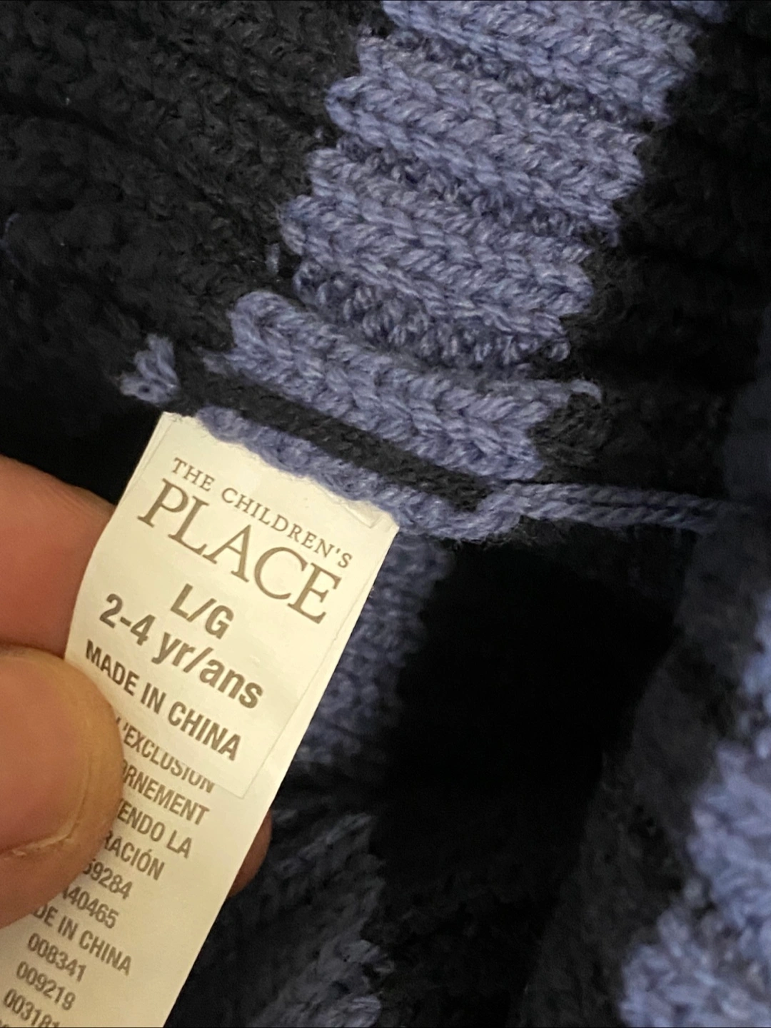 Two cute hats from The Children's Place! One is grey with red stripes, and the other is navy with blue stripes. They're sized L/G, suitable for 2-4 year olds. The material is 60% cotton and 40% acrylic, so they're nice and cozy for your little one.