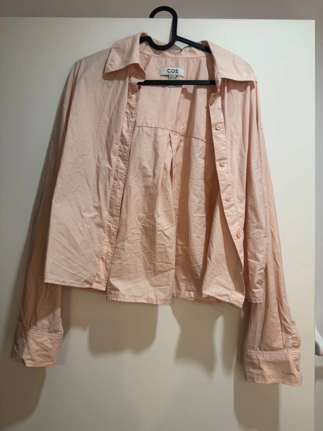 Here's a lovely light pink button-down shirt from COS! It's in great condition and ready for a new home. Perfect for adding a touch of colour to your wardrobe. (Needs to be ironed)