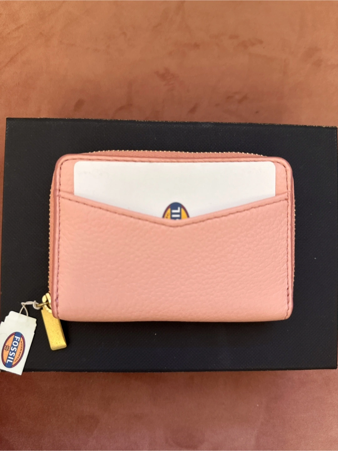 Selling a brand new Fossil mini wallet zip card in a lovely peach- pink leather shade.