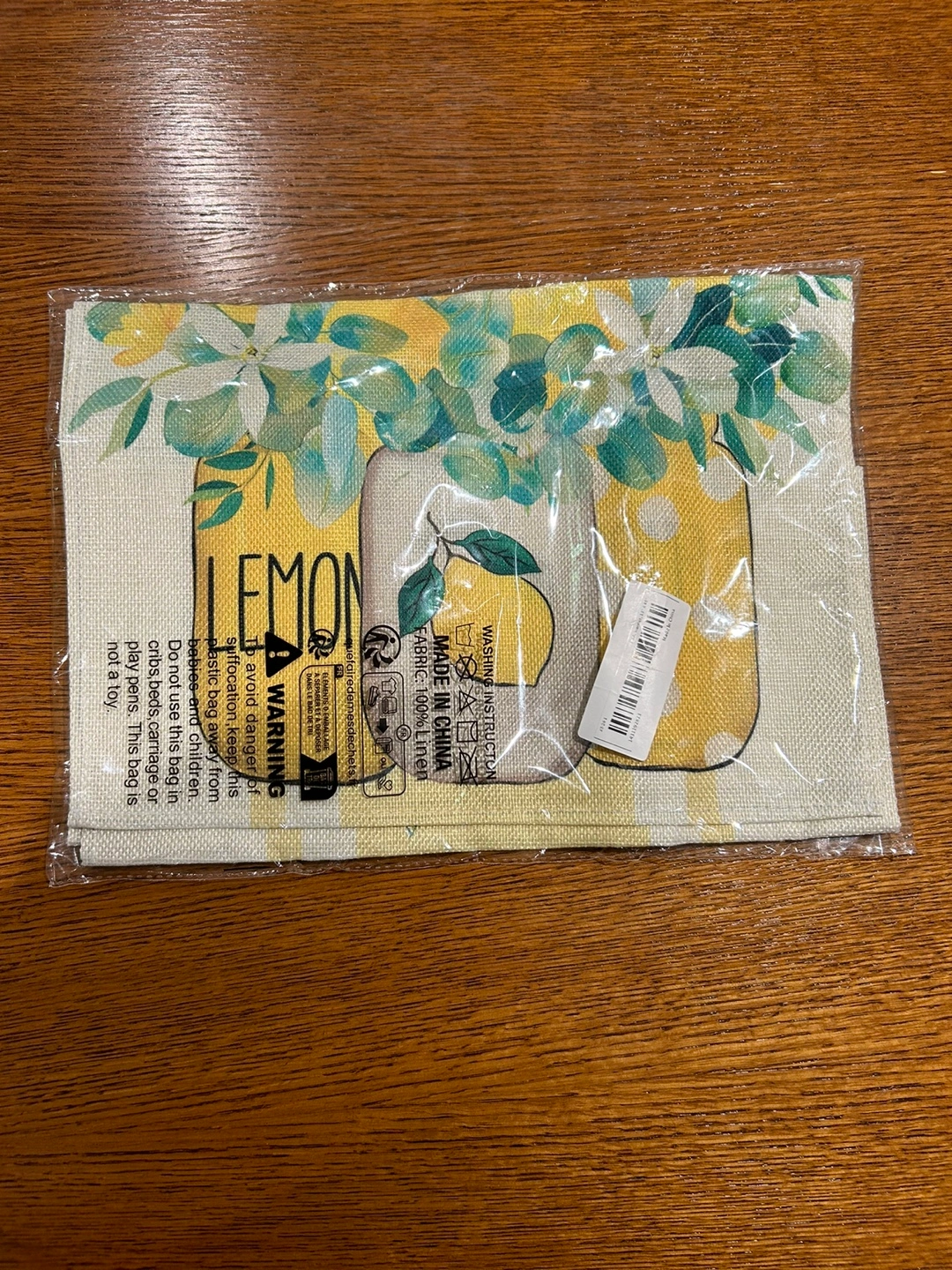 I have a brand new table runner still in its original packaging! It has a cute lemon print and measures 13 inches by 48 inches. Perfect for adding a fresh touch to your table setting.