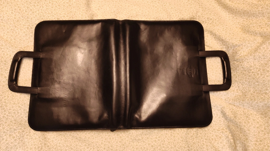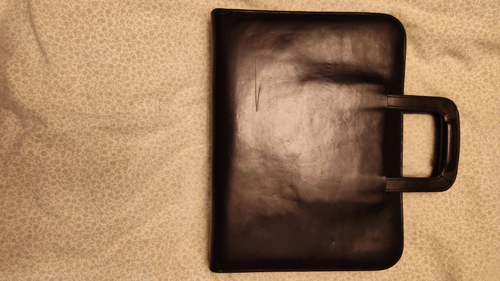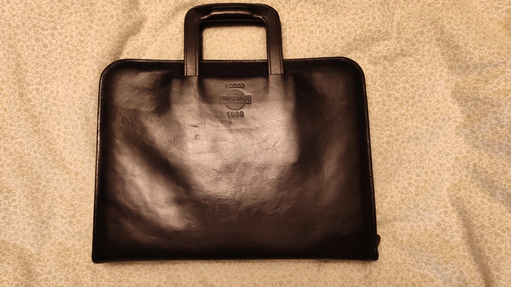 Here's a black leather portfolio with the Nissan 1996 logo. It has a handle for easy carrying and a zipper closure. Inside, there are several pockets and a ring binder to keep your documents organized