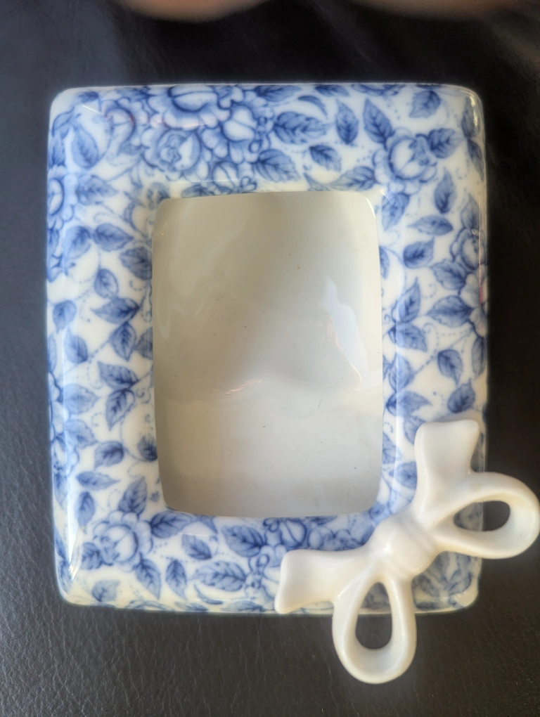 A cute ceramic picture frame with a blue floral pattern and a little bow on the side! It's in great shape and ready for your favourite photo