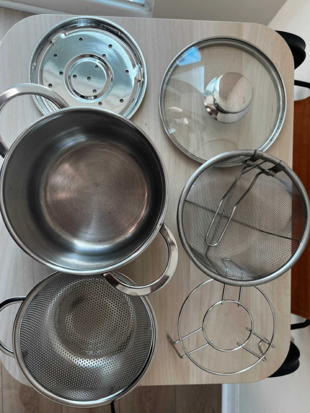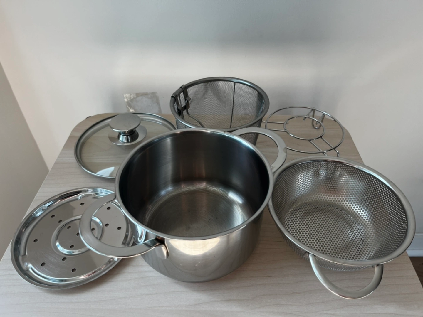 263Handy and compact cooking bundle: a Zwilling 6” stainless steel pot with all its original accessories (lid, steamer insert, mesh basket, base plate, rack) plus a same-sized stainless steel colander. Great for everyday stovetop cooking, steaming veggies, straining pasta, or prepping small portions. Everything fits together neatly for easy storage. 📍Pickup near Union Station