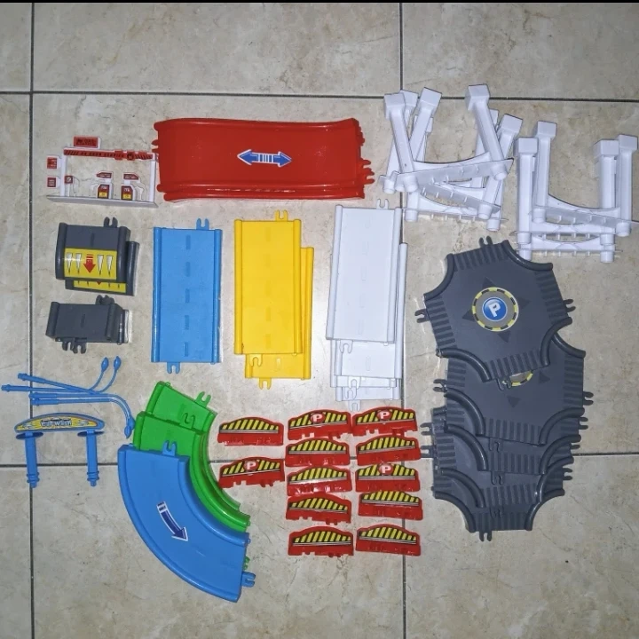 Fun toy car track set! It comes with various colorful pieces to create a unique road system. Includes road pieces, parking areas, a car wash, and more. Perfect for imaginative play!
