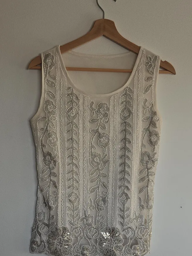 Here's a lovely top featuring embellishments! It's in great condition and ready for a new home. The design adds a touch of elegance to any outfit, perfect for dressing up or down. It's a great piece that's sure to catch the eye