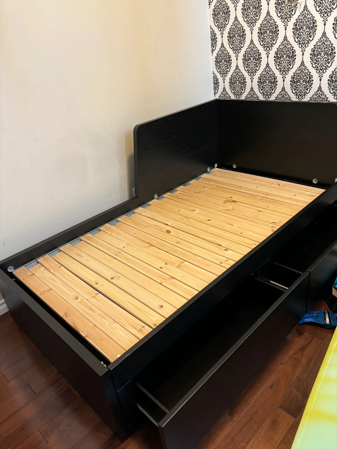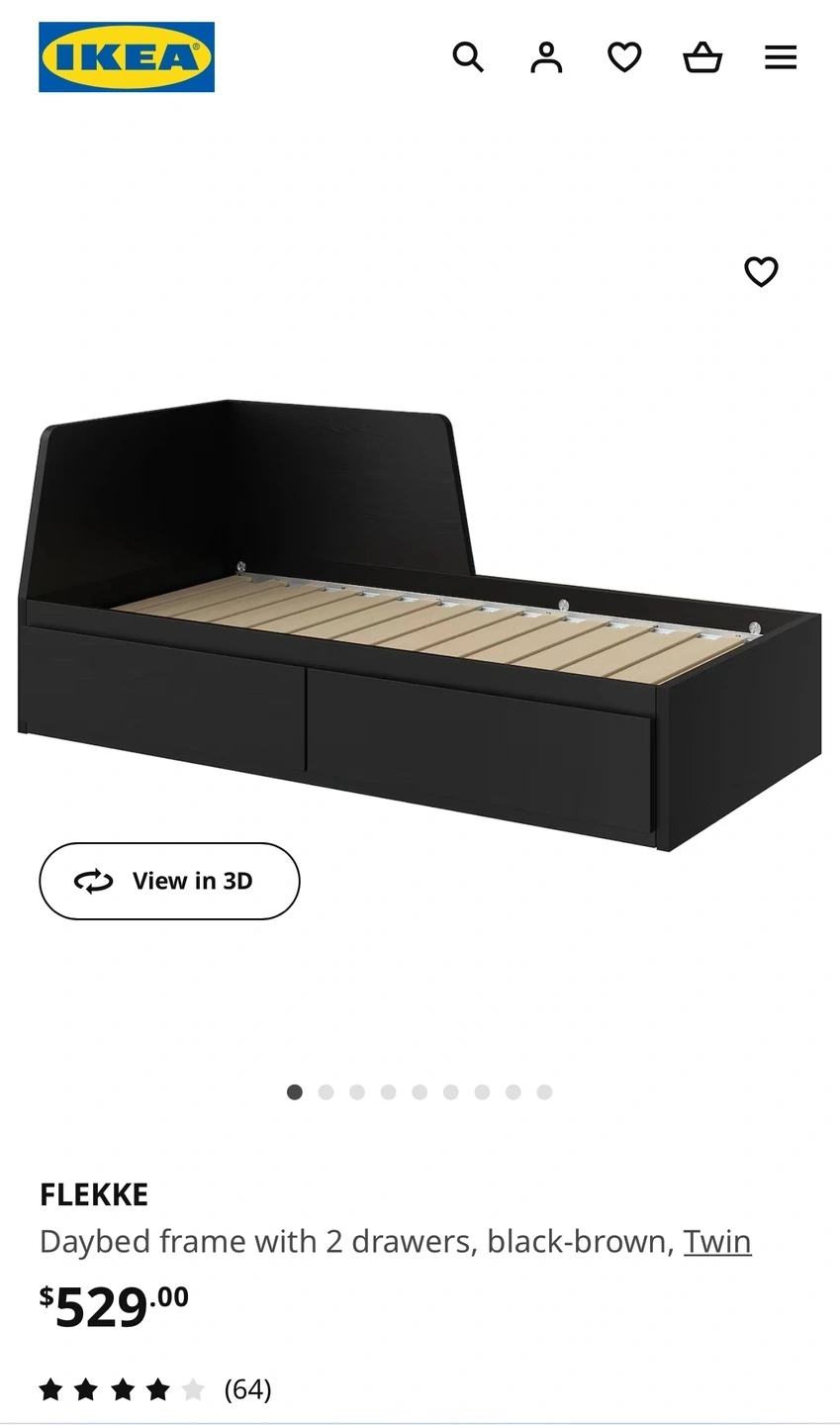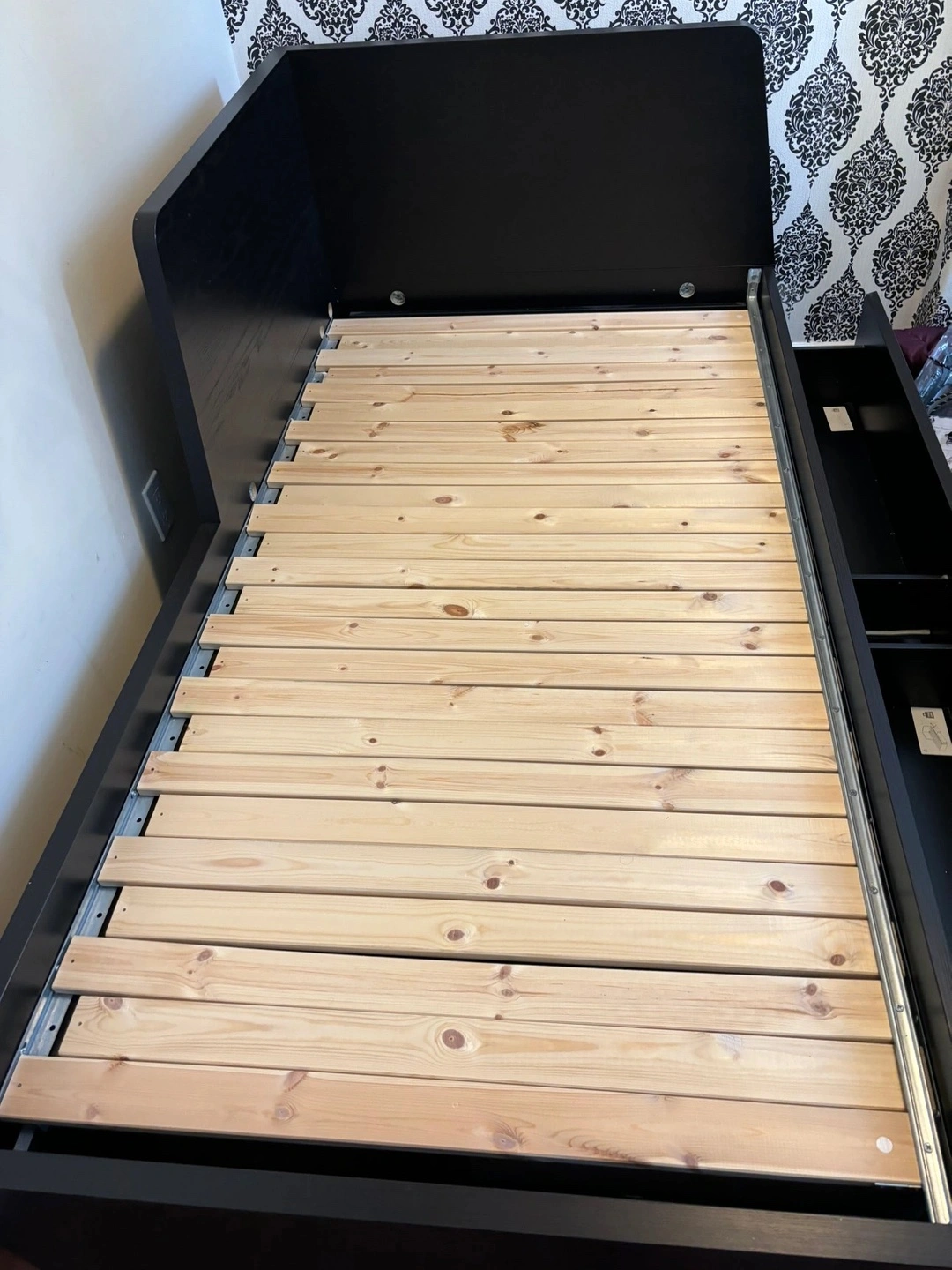 Selling an IKEA Flekke daybed frame with two drawers in black-brown. It's a twin-sized bed frame, perfect for a bedroom or guest room.