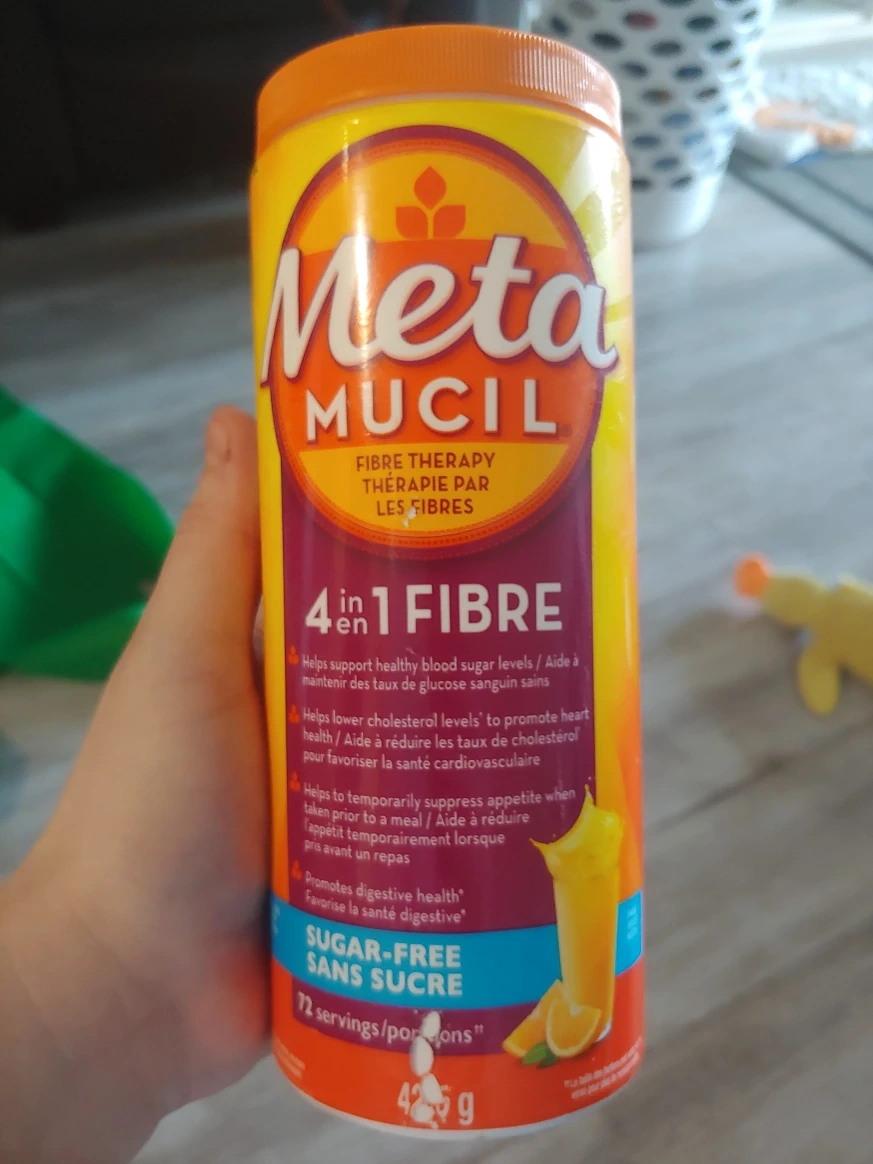 Selling a container of Meta Mucil 4 in 1 Fibre Therapy. It helps support healthy blood sugar levels, lower cholesterol levels, temporarily suppress appetite when taken before a meal, and promotes digestive health. It's sugar-free and contains 72 servings, with a net weight of 425g