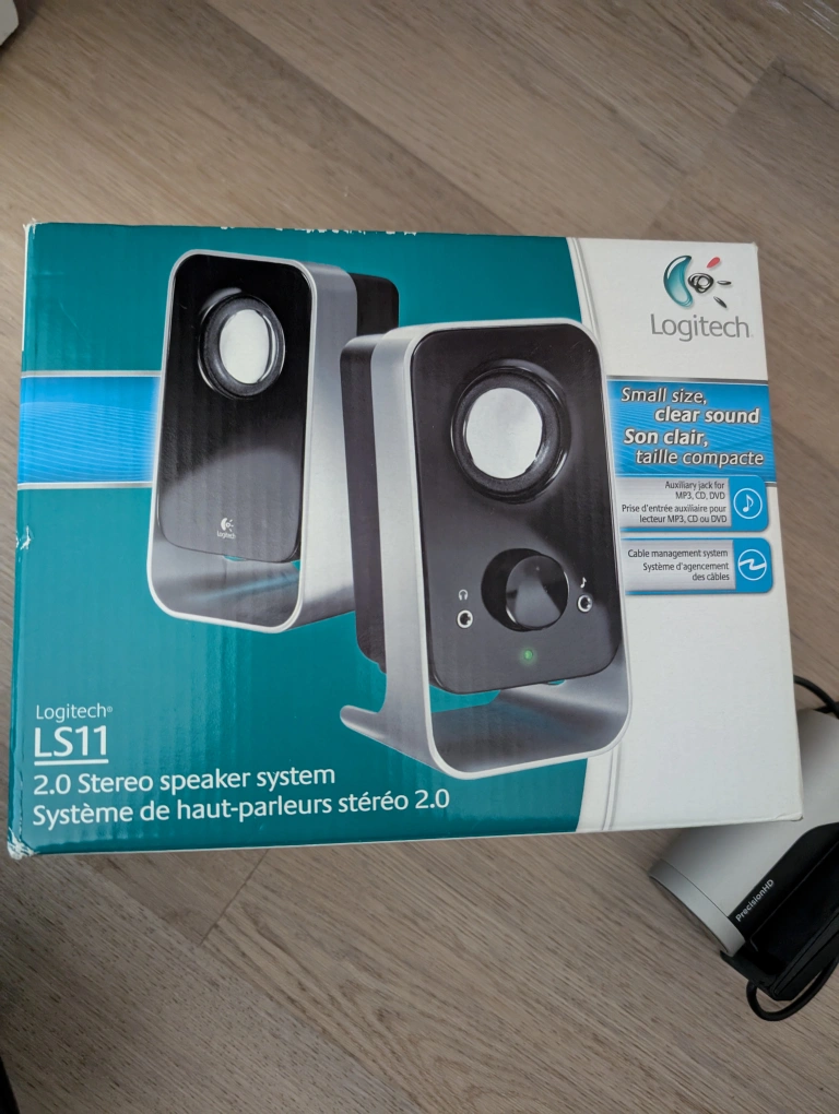 Selling a Logitech LS11 2.0 stereo speaker system. It's in great shape and comes in its original box. It's small size and clear sound make it perfect for your desk or small space. It also has an auxiliary jack for MP3, CD, and DVD players and a cable management system