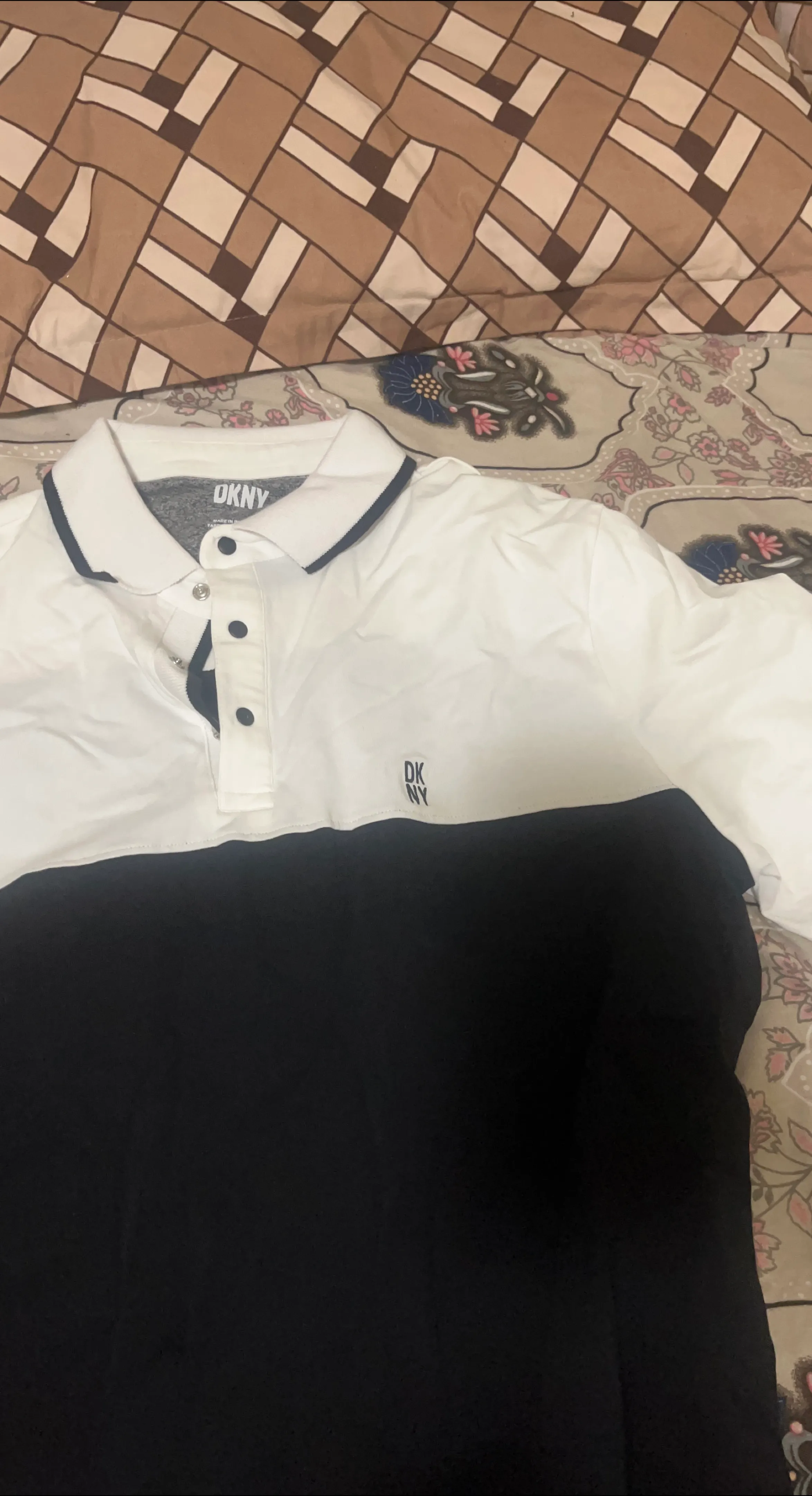 Selling a DKNY polo shirt in a classic black and white colour block design. It's in great condition and ready for a new home!