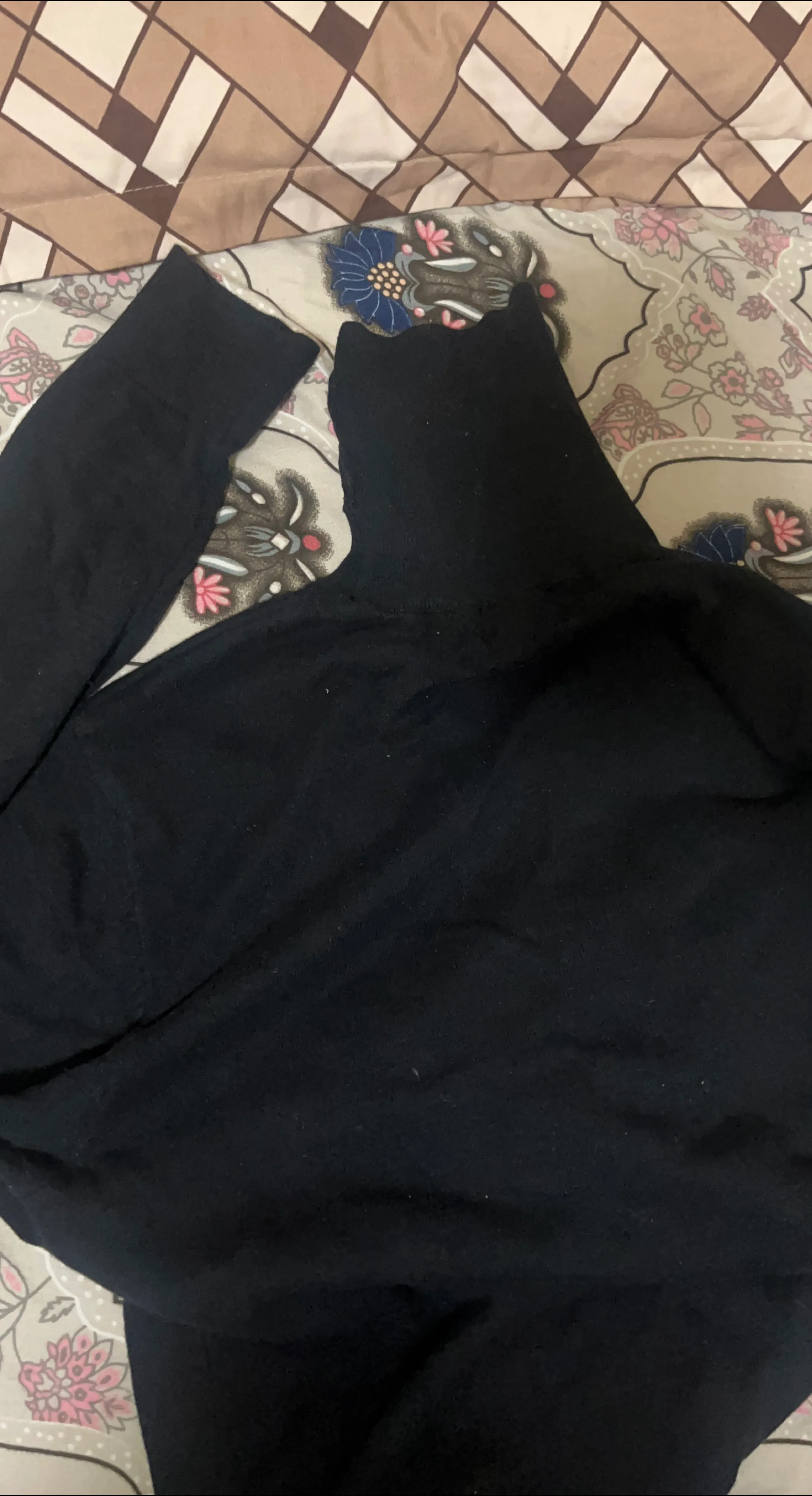 A simple black turtleneck sweater, perfect for layering or wearing on its own. It's in good condition and ready for a new home