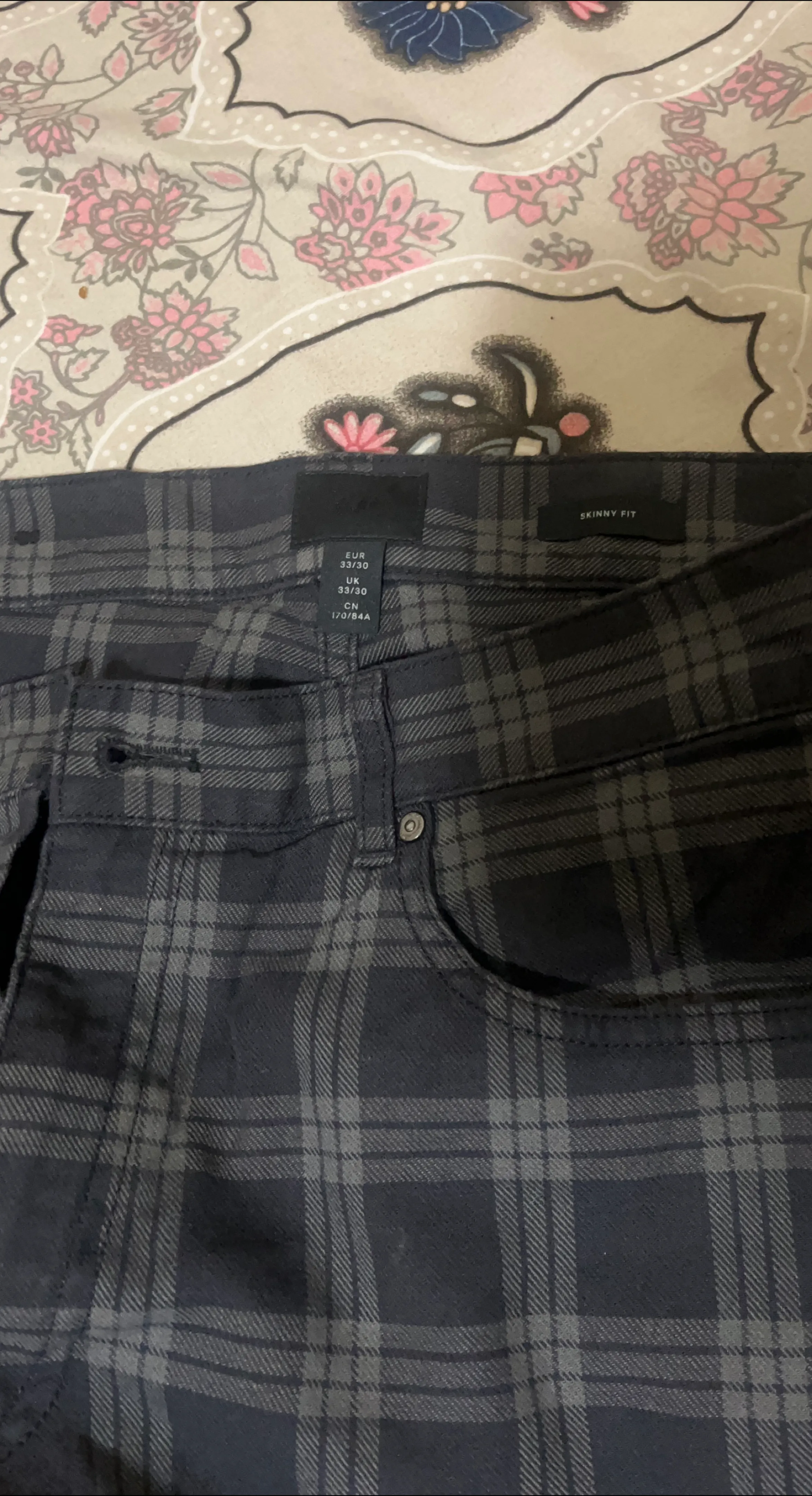 Selling a pair of H&M skinny fit pants in a cool plaid pattern! They're a size 32 and in great condition, ready for a new home. Perfect for adding some style to your wardrobe!