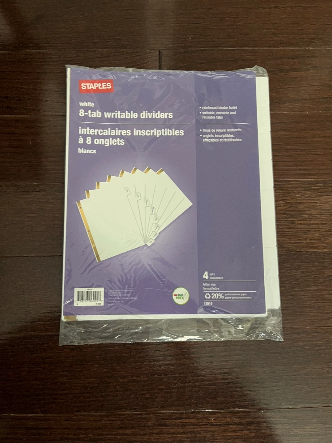 Selling a brand new pack of Staples white 8-tab writable dividers! It includes 4 sets of letter-size dividers, perfect for keeping your documents organized. The tabs are writable, erasable, and reusable, and the binder holes are reinforced for extra durability