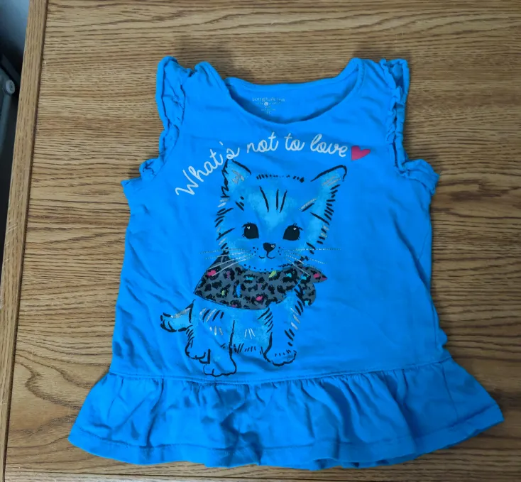 It features a sweet cat graphic with the words "What's not to love" written above it. The shirt has ruffled sleeves and a ruffled hem, adding a touch of fun to any outfit.