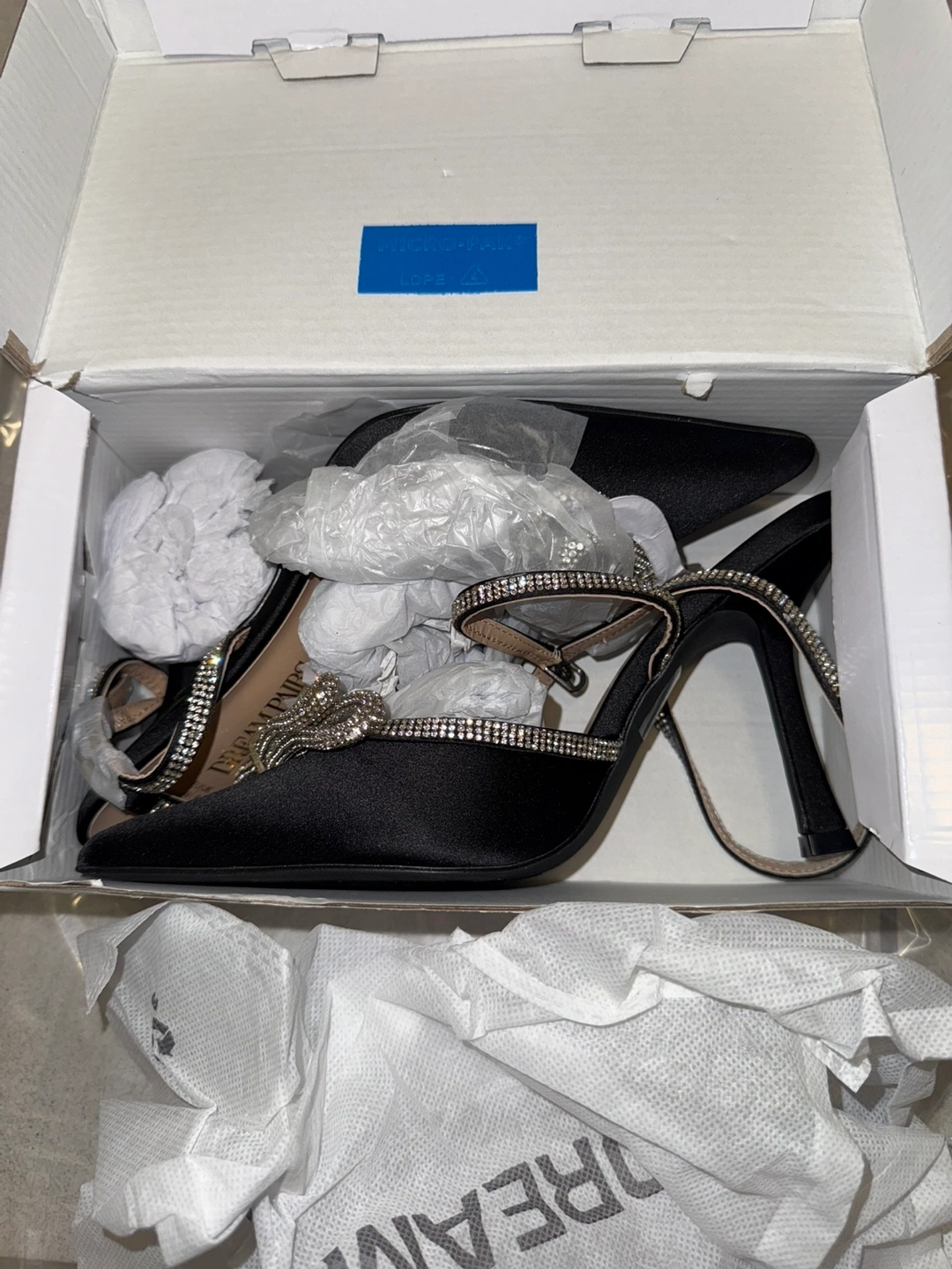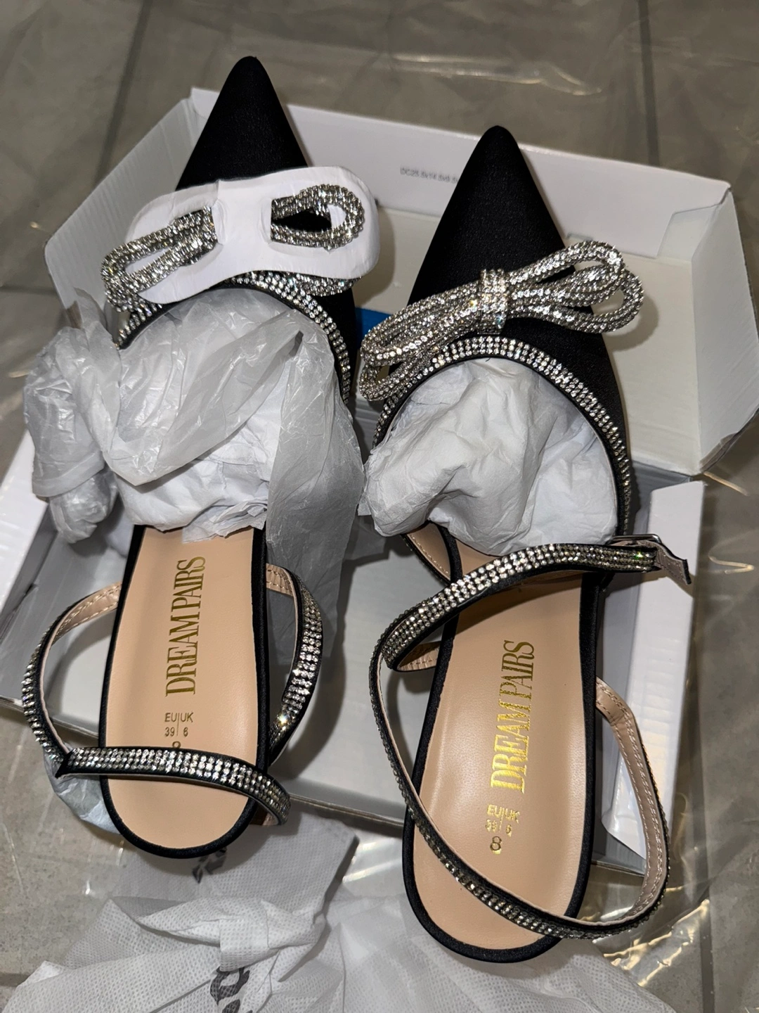 261These Dream Pairs heels are a stunning addition to any wardrobe! They're a size 8 and feature a sleek black design adorned with sparkling rhinestones. The box is included, so they're ready to step out in style!