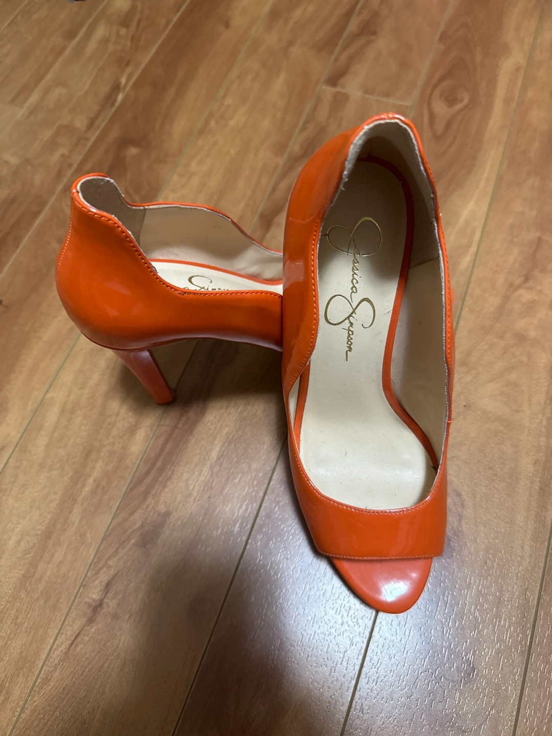 Selling a pair of Jessica Simpson heels in a vibrant orange colour. They are in good condition and ready for a new home!