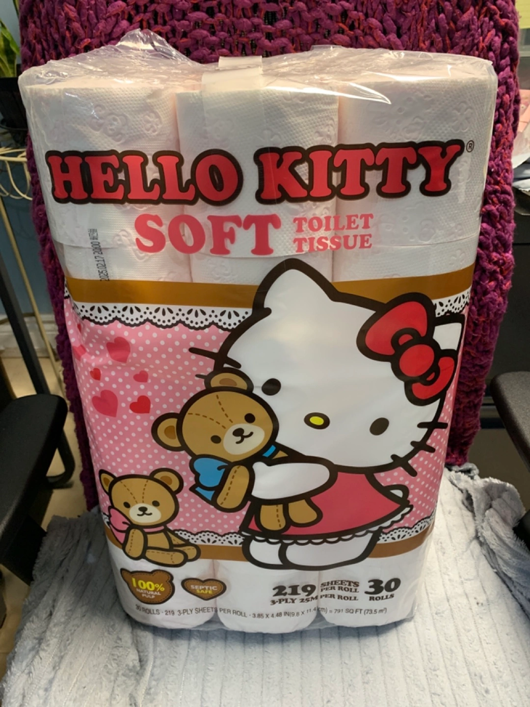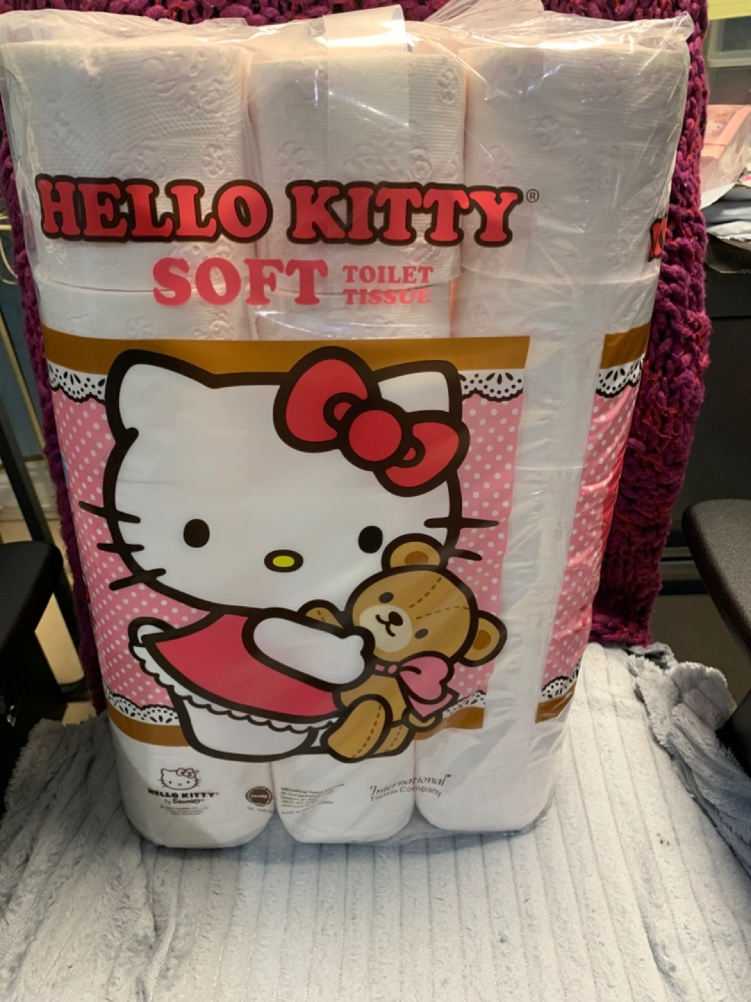 Selling a pack of Hello Kitty Soft Toilet Tissue! This pack includes 30 rolls, each with 219 sheets of 3-ply tissue. It's 100% natural and super cute for any Hello Kitty fan