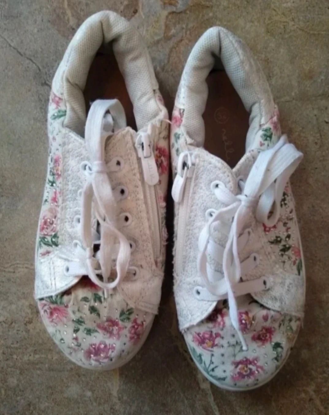 Girl's canvas floral print running shoes with rhinestones. Size 1.5. Laces can be tied up or zippers may be used for easier wearing. In excellent condition!