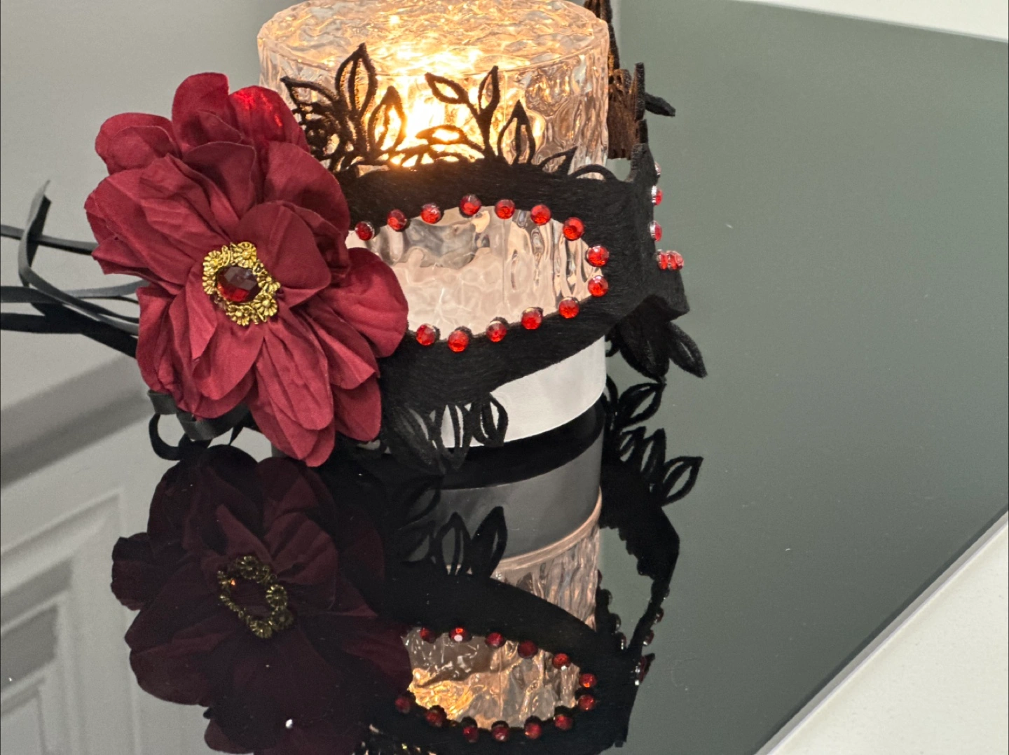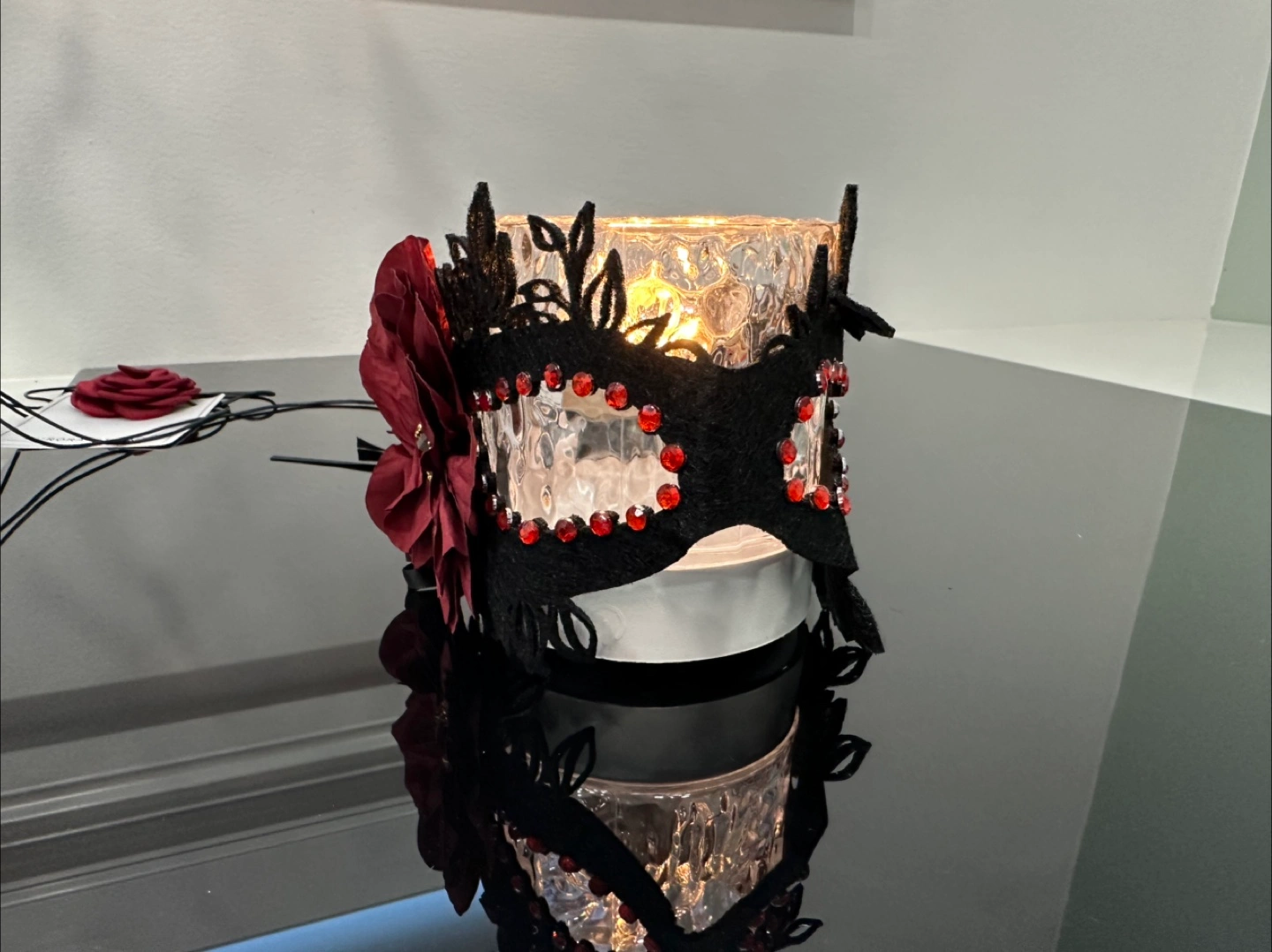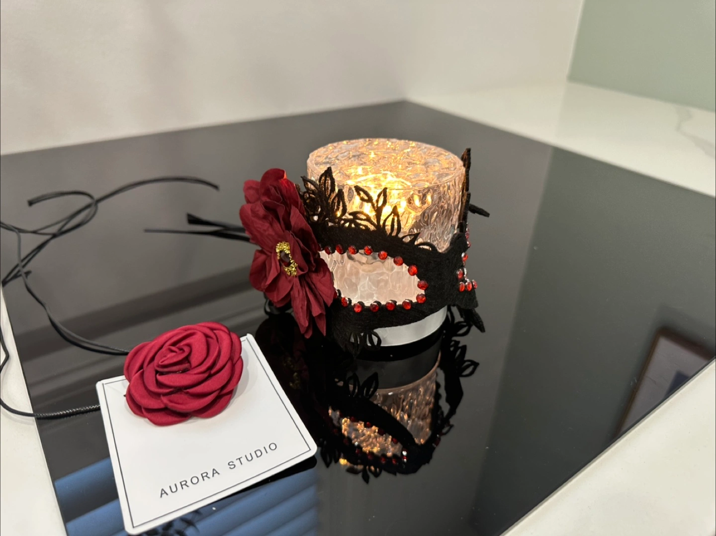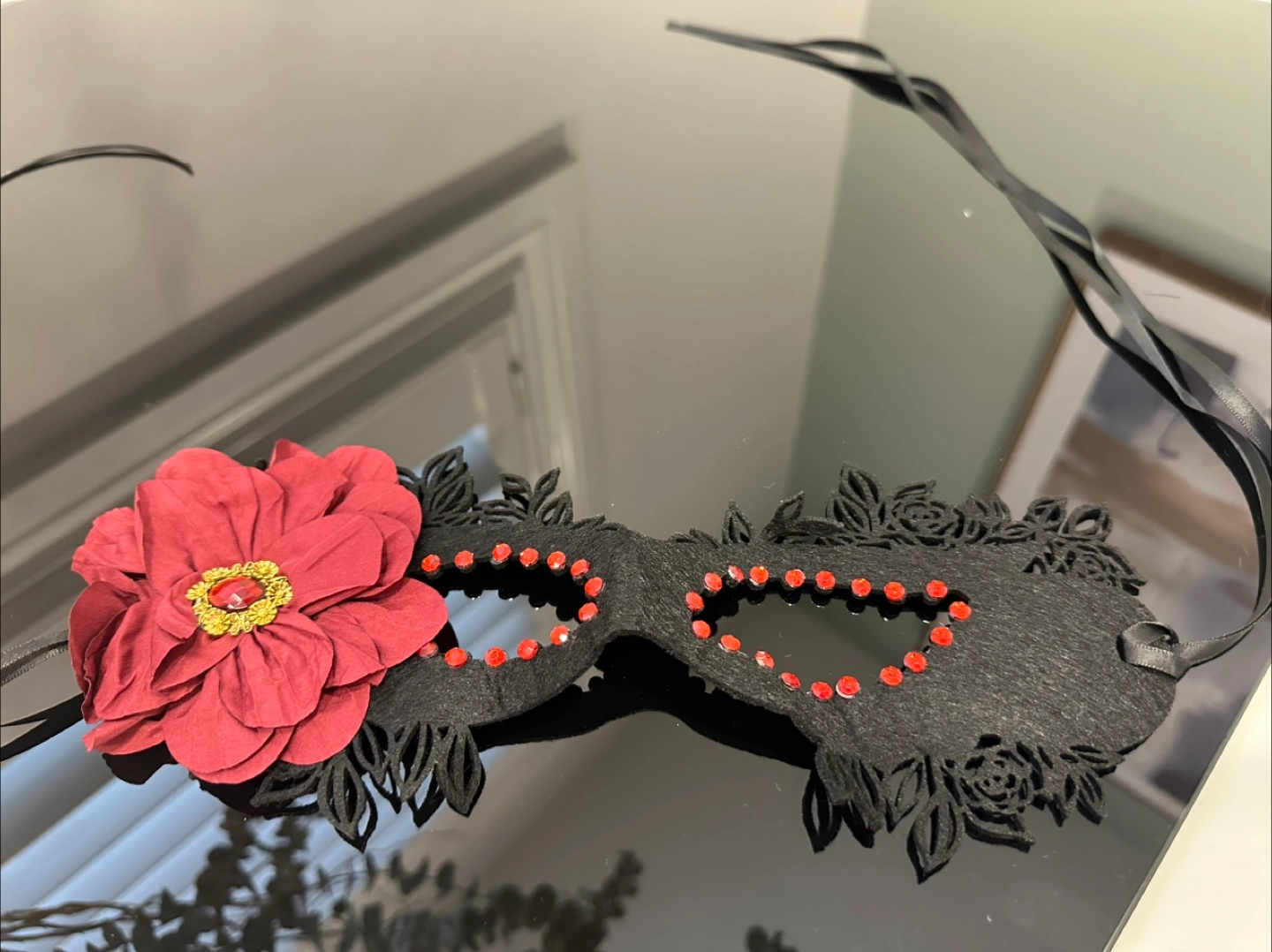 Selling a unique floral masquerade mask from Aurora Studio! It features a beautiful red flower accent and intricate black detailing. Perfect for adding a touch of elegance to any occasion