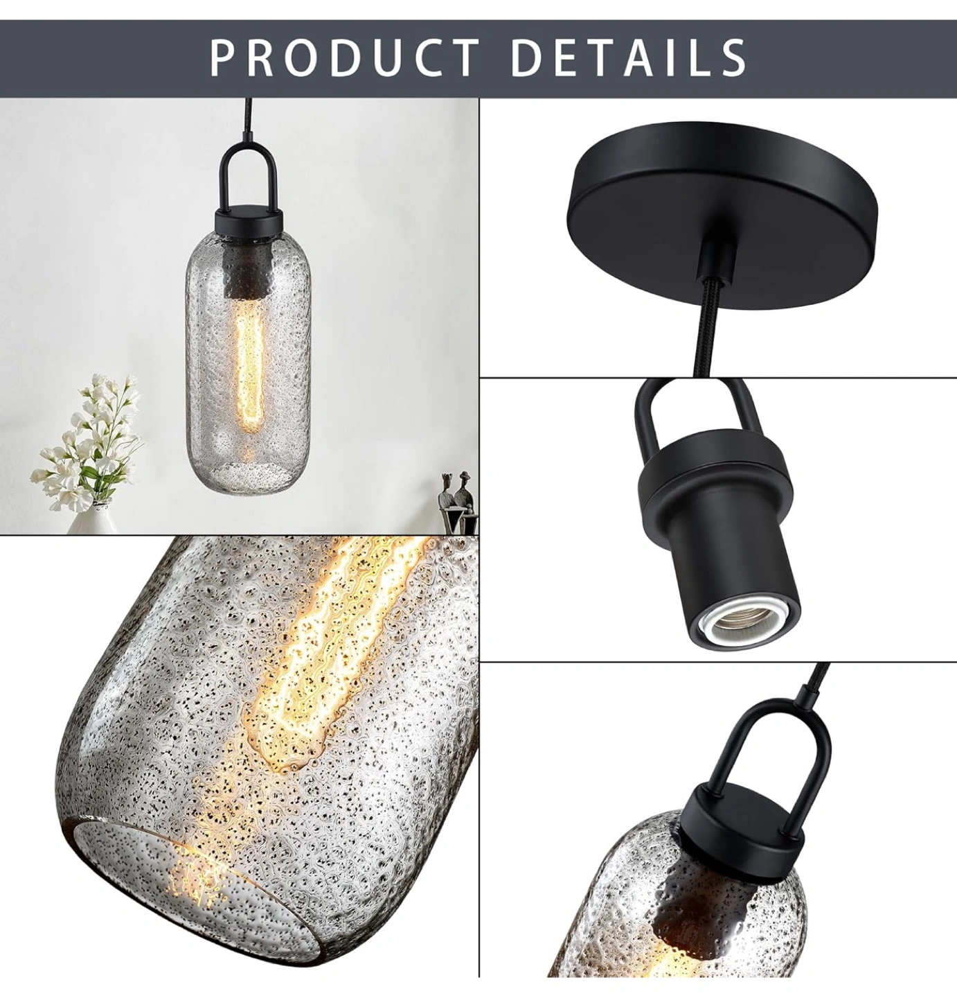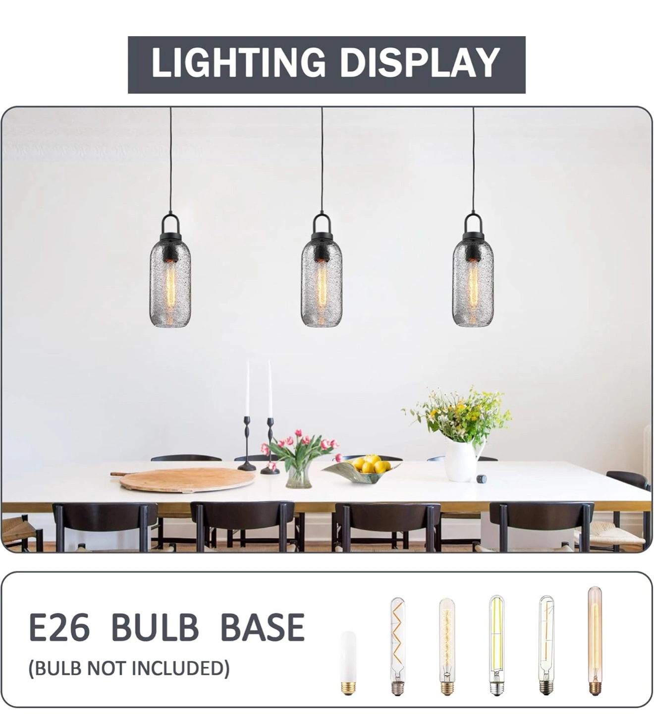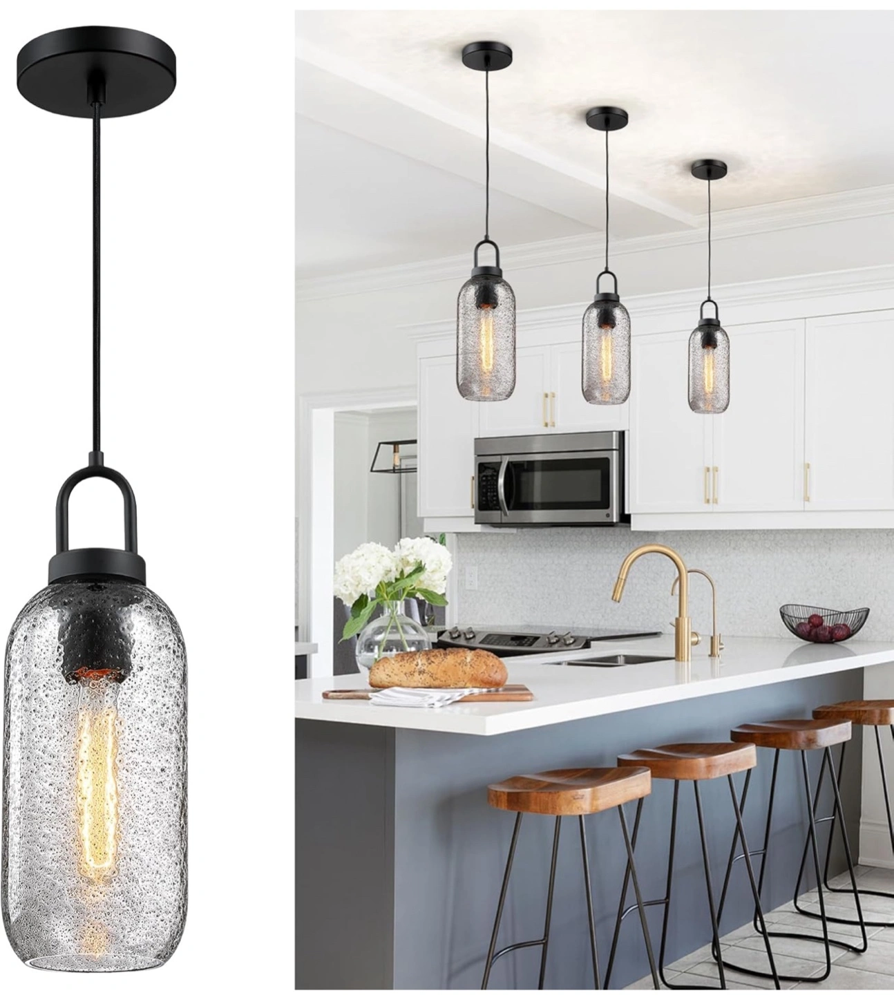 261Giiland brand Set of three pendant lights perfect for a kitchen island or dining area! They feature a unique textured glass design and a sleek black finish. The lights use an E26 bulb base (bulbs not included).