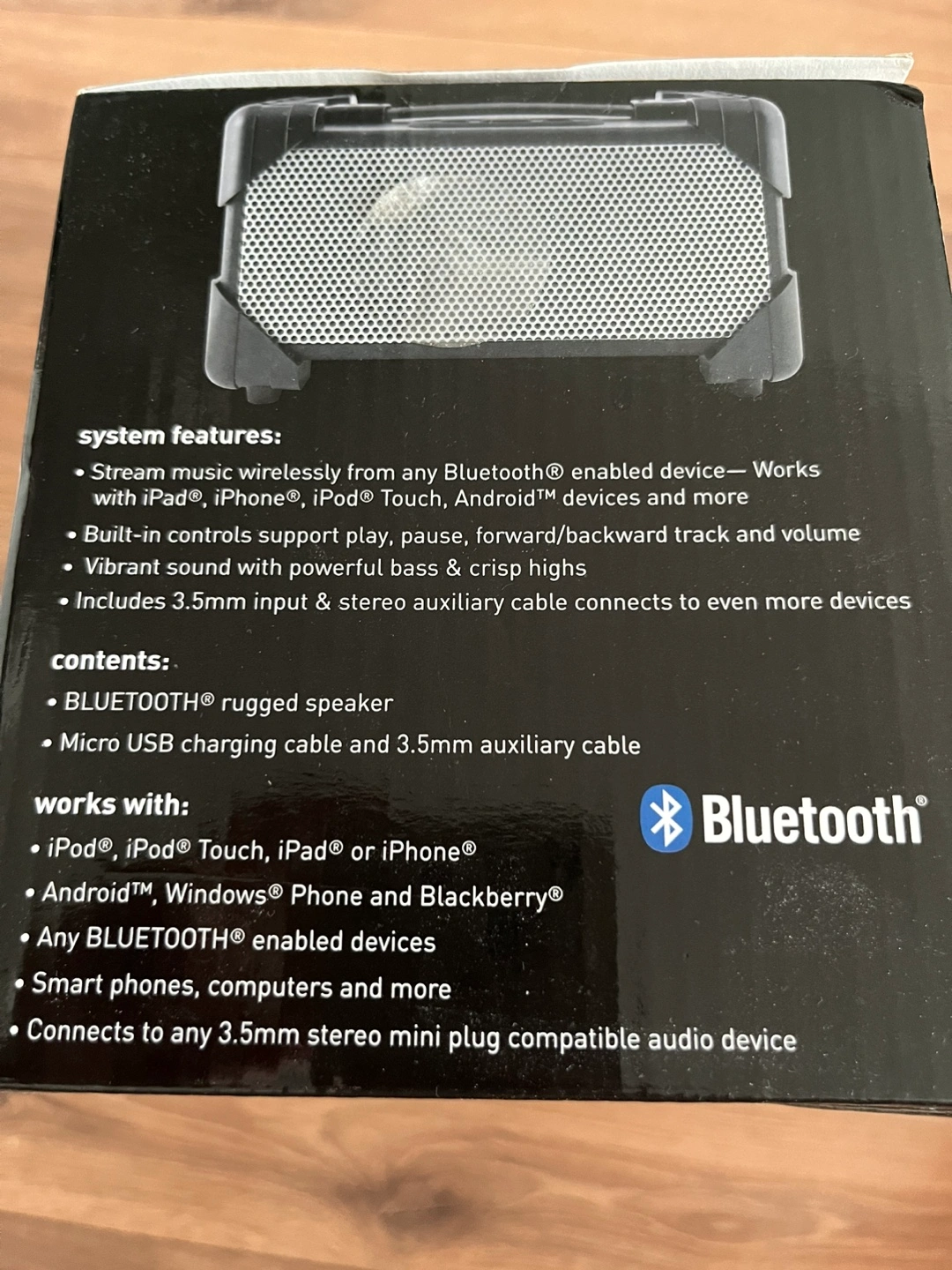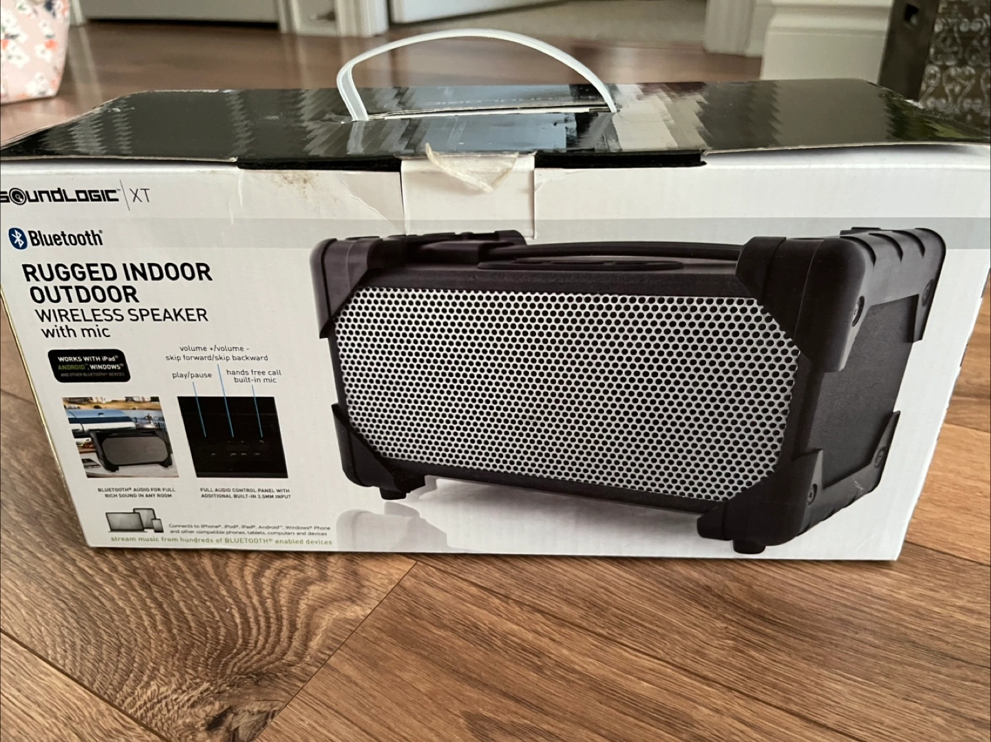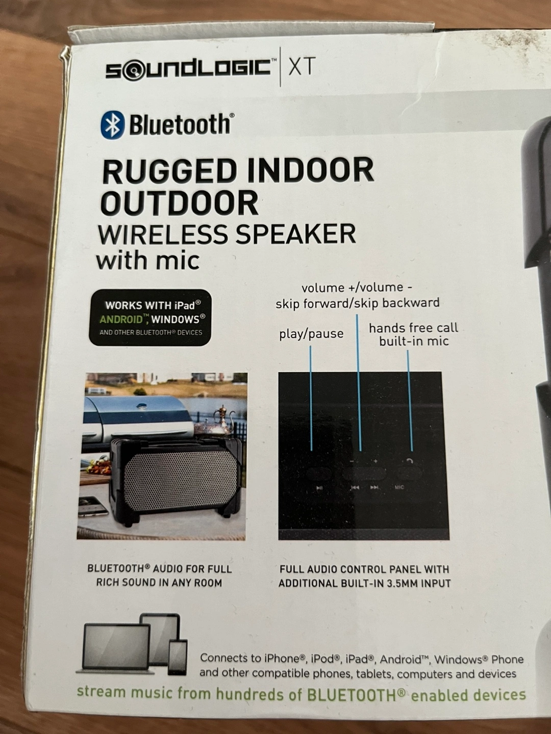 Selling a Soundlogic XT Rugged Indoor Outdoor Wireless Speaker with mic. It's Bluetooth compatible and works with iPads, iPhones, iPods, Android devices, Windows devices. It has a built-in control panel with additional 3.5mm input. Includes a micro USB charging cable and 3.5mm auxiliary cable and connects to any 3.5mm stereo mini plug compatible audio device. Stream music wirelessly from any Bluetooth enabled device with vibrant sound and powerful bass and crisp highs.